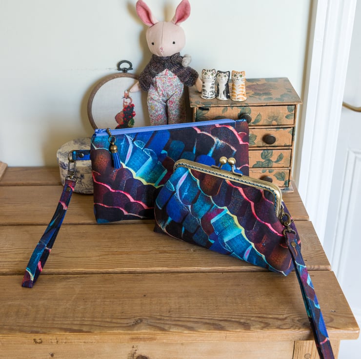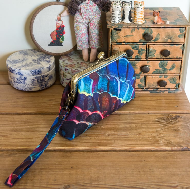 This purse is made with a tana lawn print by Liberty of London called 'Irridescence'. The textural design evokes the notion of flight and migration, epitomising the cross continental journey of the Silk Road in tones of blue, bronze, browns and highlights of yellow and red. I interface the silky fine lawn with 2 layers of woven cotton to give it structure and strength and add a soft fleece to protect the contents. The wristlet strap is made from the same fabric as the outer and the lining of the purse is made with an azure blue quality cotton, which is also interfaced with woven cotton to ensure longevity and add more structure to the bag overall. There's an option to add a 2 slot panel on one side of the lining, which is perfect for carrying a couple of credit cards, or anything you like of a similar size. I also add a toning tassel to the zip top bag with a simple lobster clasp.