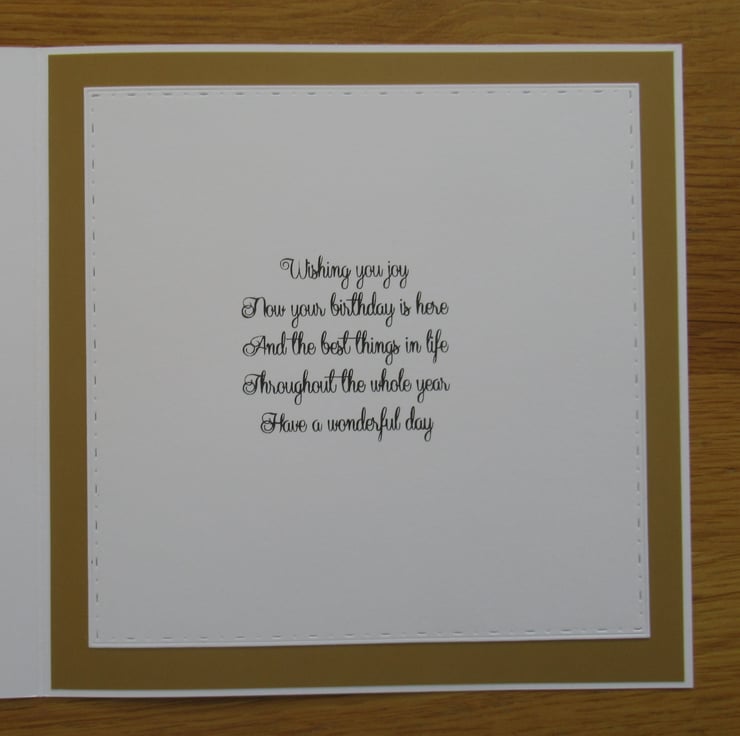 This lovely card in sepia tones features a vintage racing car on the race track. I used decorative dies to cut layers from gold and cream card which frame the image and placed them all upon a black background card. I added a birthday greeting down one side and the inside has been finished to coordinate with a stamped verse as pictured.