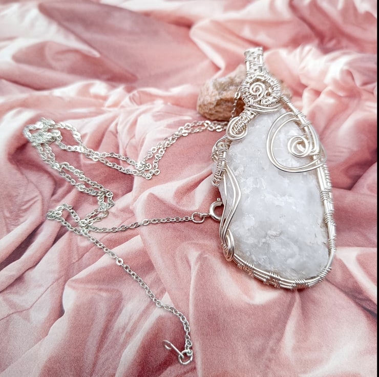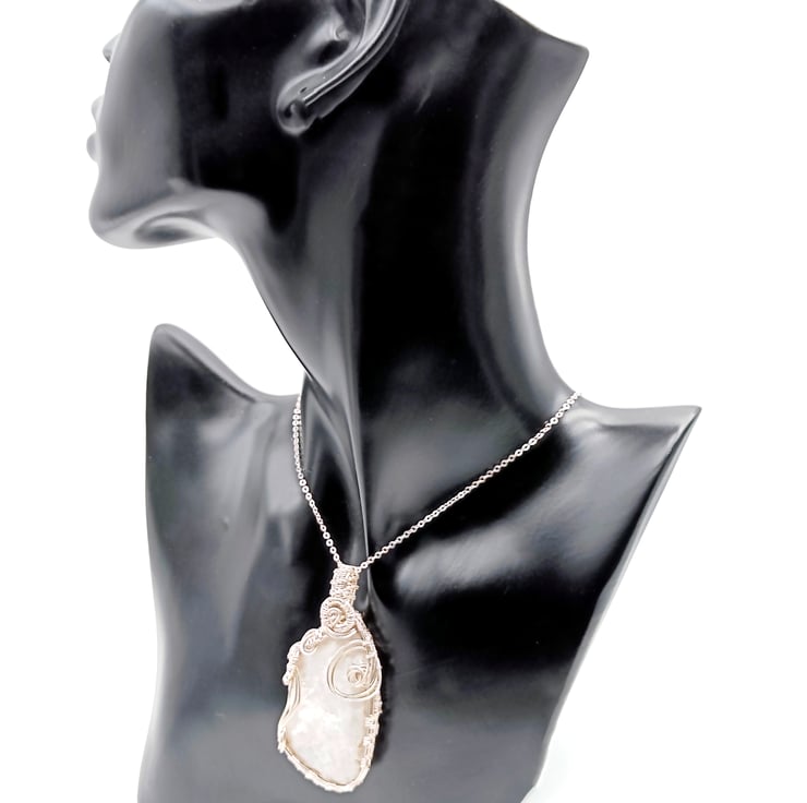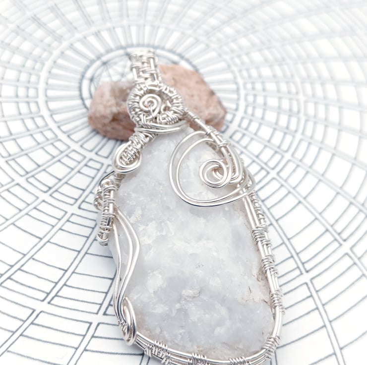 The pendant came to life using tarnish resisitant silver plated copper wire. The motif and the wrapping was informed by the shape of te stone, and came to be in a very oganic and channeled way.