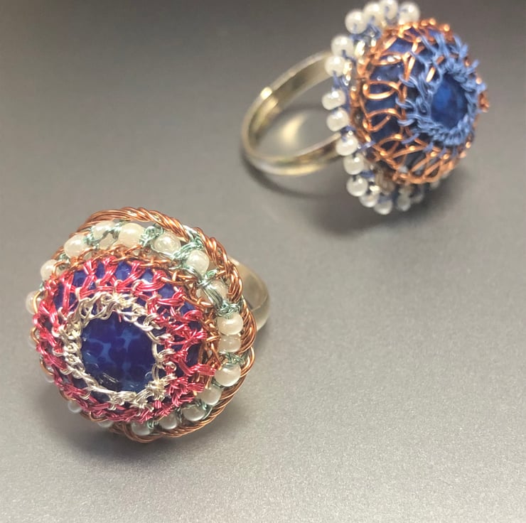 Seed pearl ring - sustainable jewellery - hand made beaded ring with tiny seed pearls and blue ceramic bead (blue) is made with recycled & repurposed materials - mainly pink lacquered copper wire from old televisions with bought pale blue wire by Alison Bailey Smith - ABScraft. Built upon an adjustable silver plated ring. Inspired by the jewellery in the collection of the National Museum of Scotland - the 'Penicuik Jewels', said to have belonged to Mary Queen of Scots. Delighted that I have three pieces in their collection.