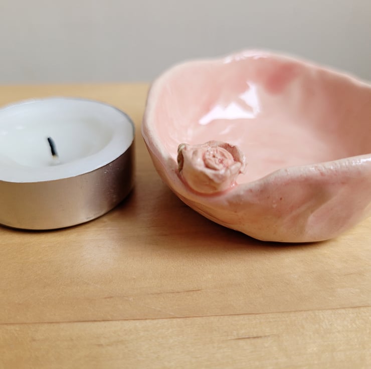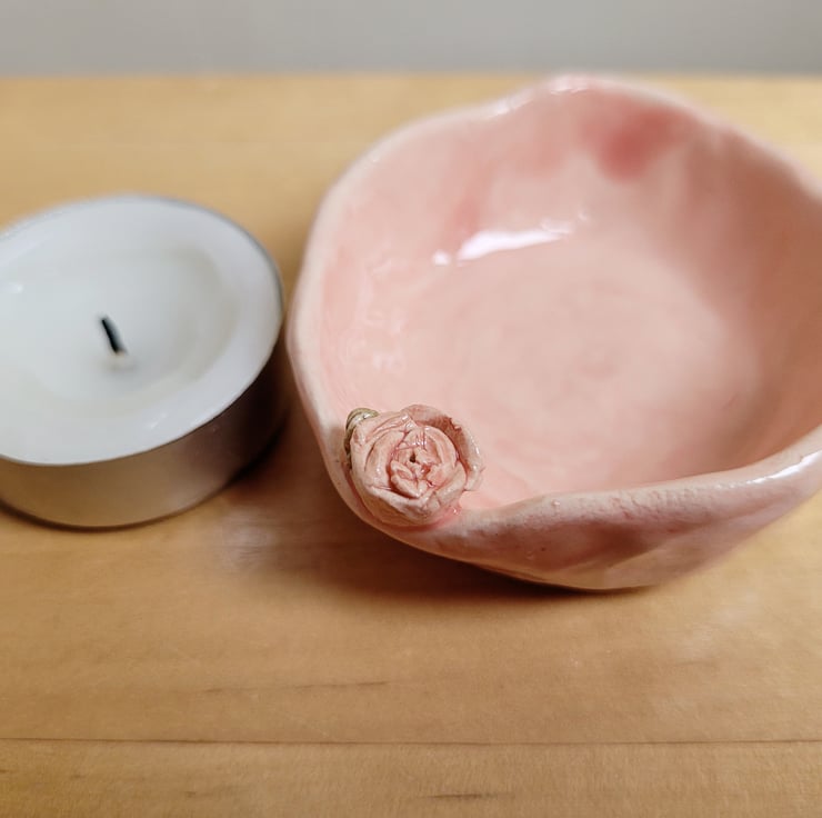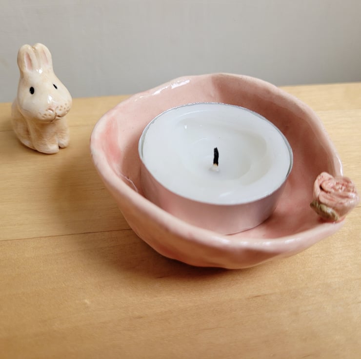 Pink rose pottery tea light candle holder. For candle lover gift or trinket pot. There is a cutout heart shape and shiny glaze .