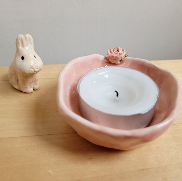 Hand modelled little rose flower tealight holder. The heart was cut out and the piece was bisque fired. It was then painted and dipped dipped in clear lead free glaze prior to the final firing