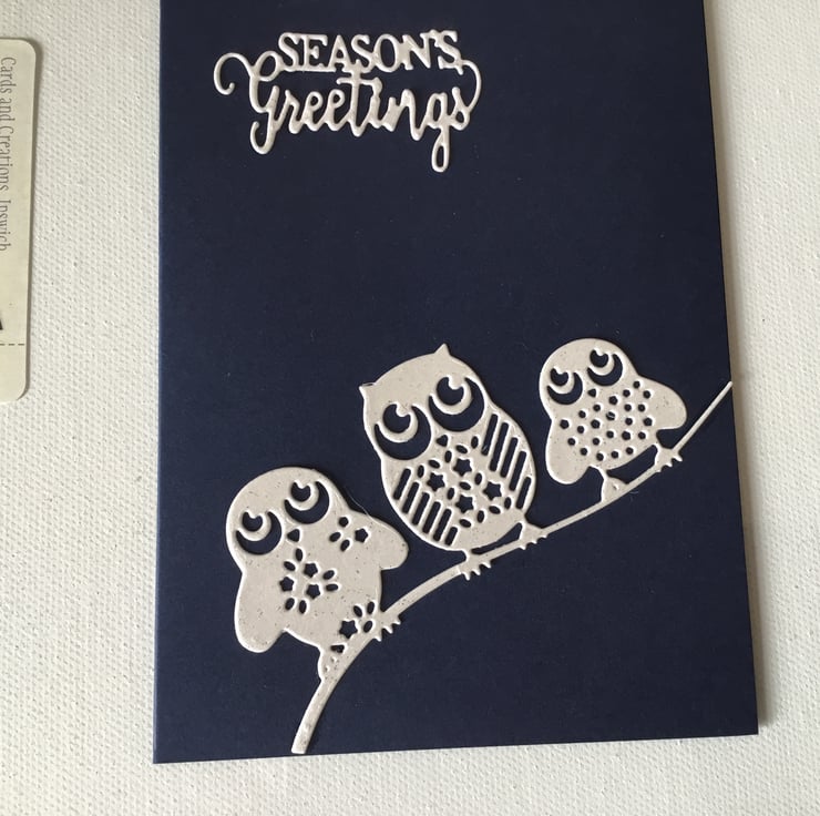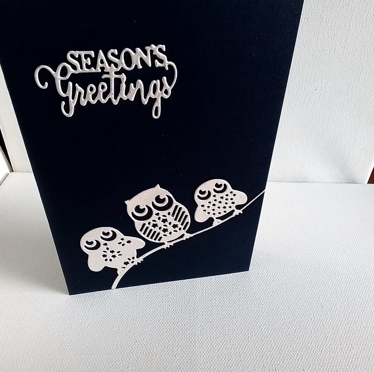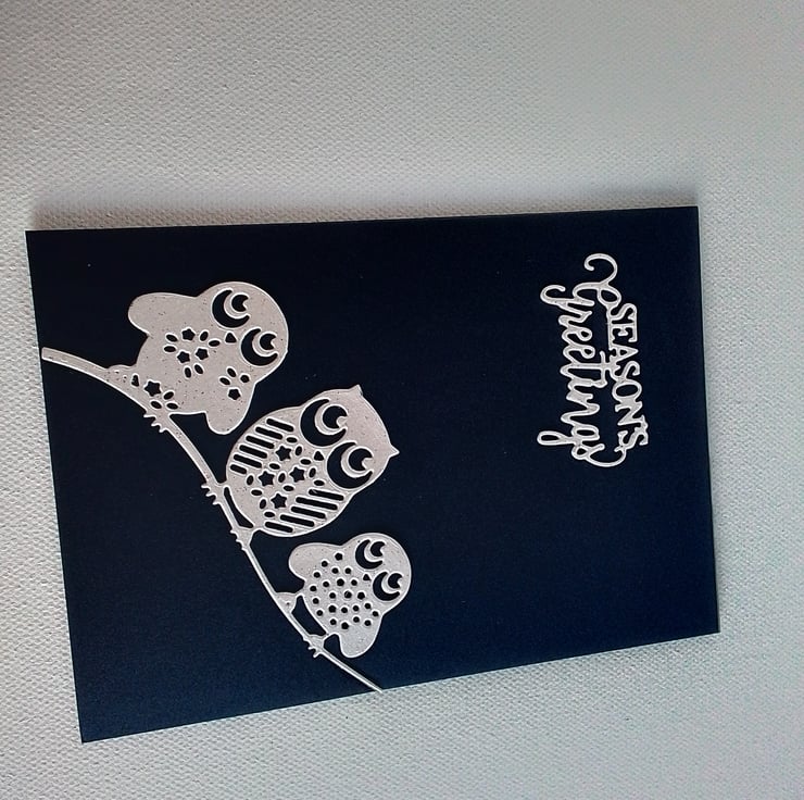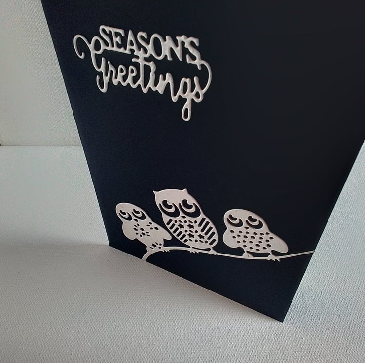 A trio of owls sending you seasons greetings, top this cute Christmas card.