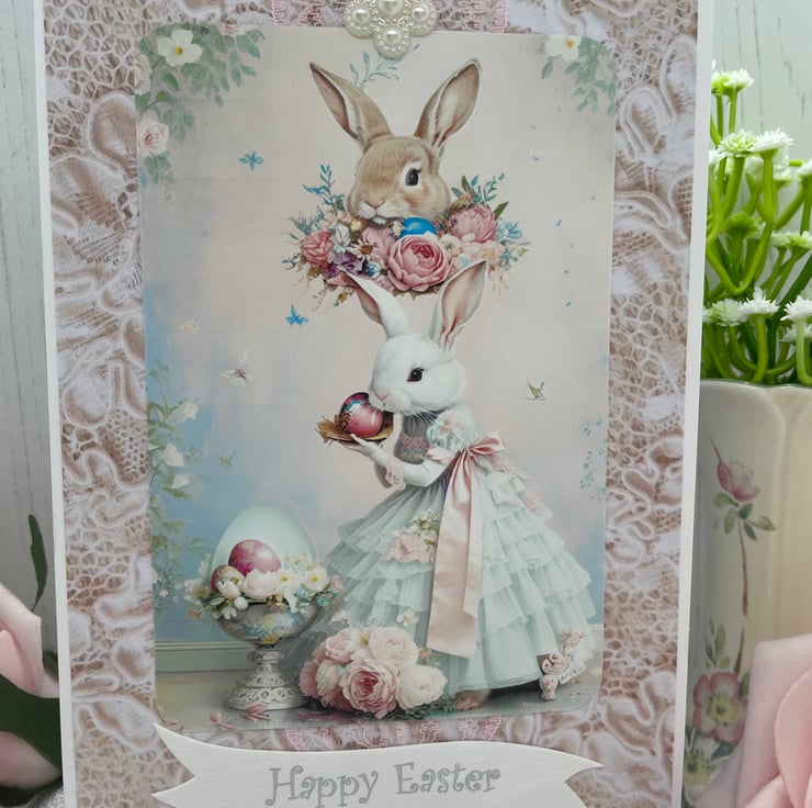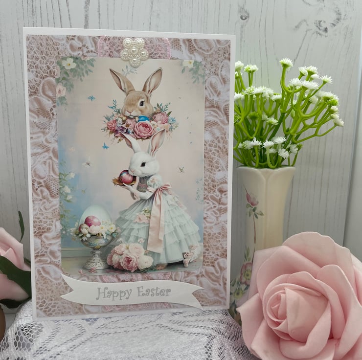 5 x 7” white card and envelope. Backing of pale pink lace paper, vintage style photo of Easter bunny. A strip of pink lace runs down the centre of the card, acrylic flower to the top and sentiment banner reads ‘Happy Easter’ silver foiled on white.