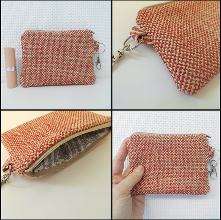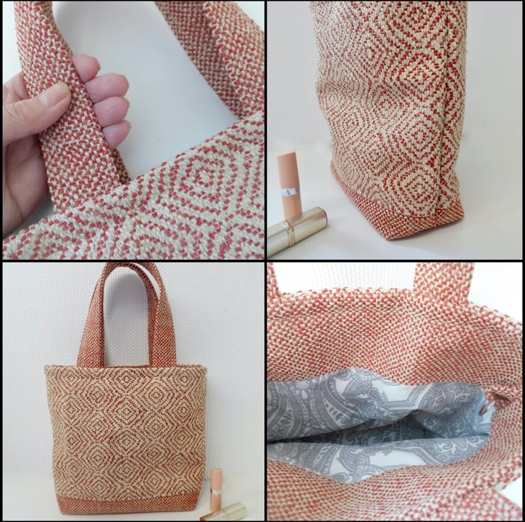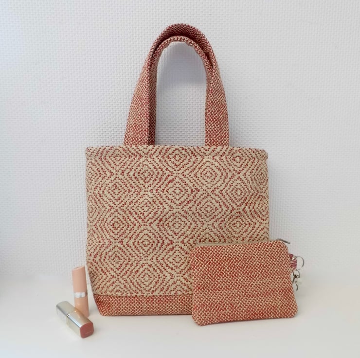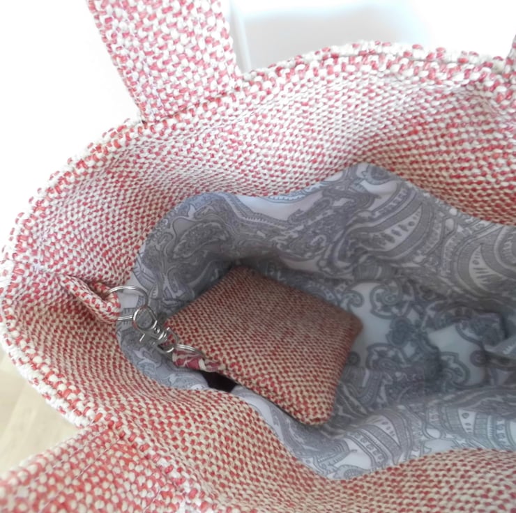 I made this bag and purse with a combination of two furnishing fabrics in red and oatmeal colours, a sturdy fabric which holds it's shape. The main body of the little tote hand bag has a diamond shape woven pattern, while the base is a coordinating fabric. It is faced at the top for a professional finish and the lower half inside is lined with grey and white paisley printed cotton. There is a keyring inserted into one of the side seams.