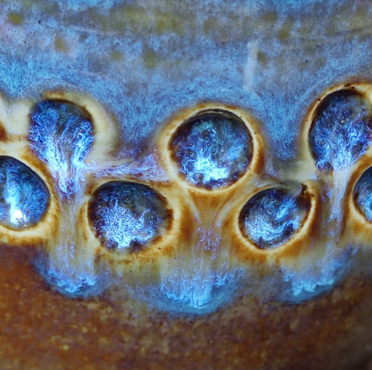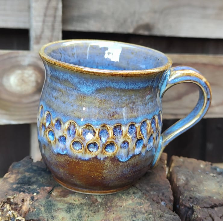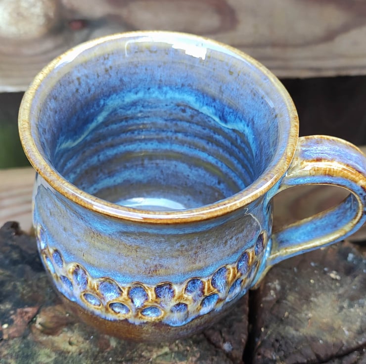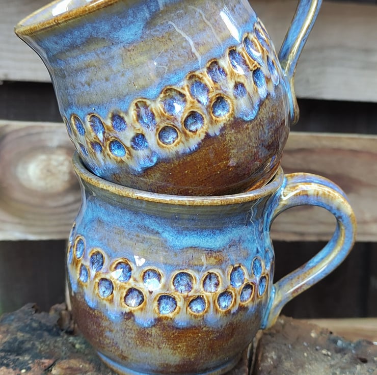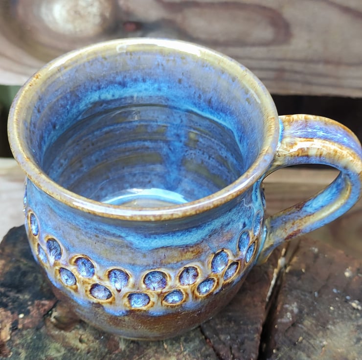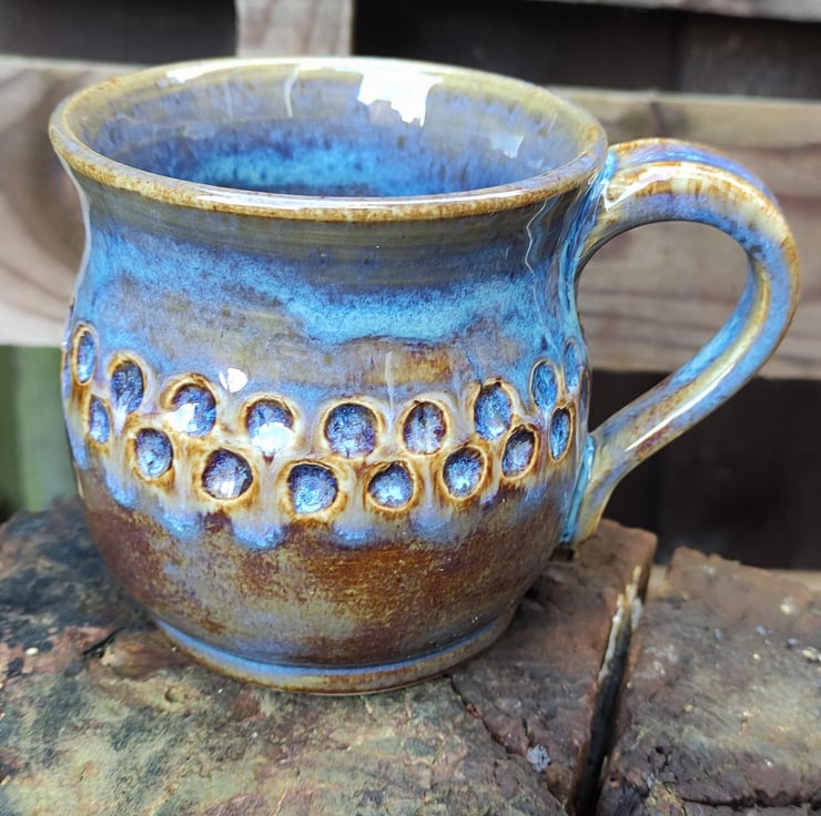 I carved circles into these mugs to give a place for the glaze to drop into. This glaze came out of the kiln a more browny blue colour but the circles did show up the blue as I had hoped...might use more glaze next time! Lovely smooth glaze, fired to c1200 degrees (stoneware temperature) and this makes the mugs more durable. Just the one of these left now.
