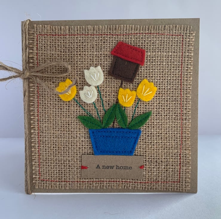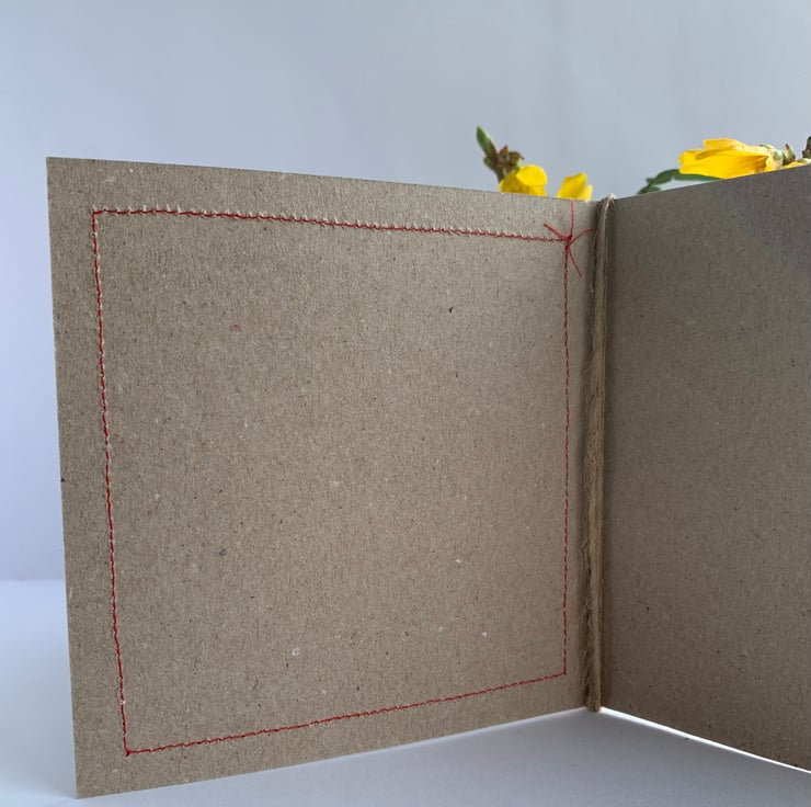 The hessian is machine stitched, using a contrasting thread, onto a plain brown recycled card. This stitching is visible on the inside of the card.