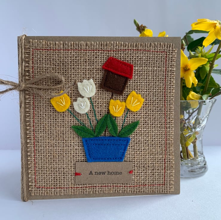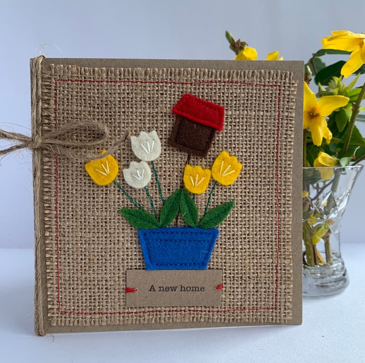 This New Home Card is decorated with bright yellow and cream flowers and a little red roofed house.