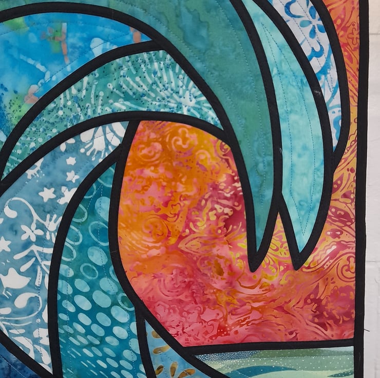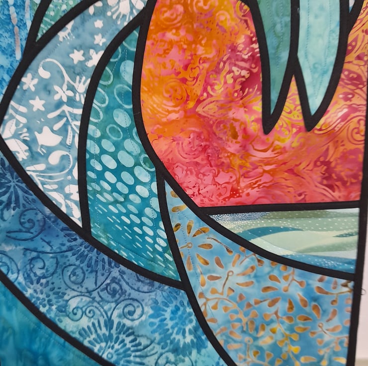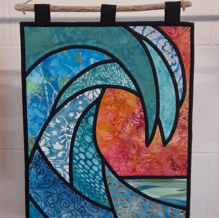 Stunning Wave stained glass applique wall hanging using bright batik fabrics. I have used a soft wadding which us made from 100% recycled plastic bottles which and quilted each section to give depth and texture.