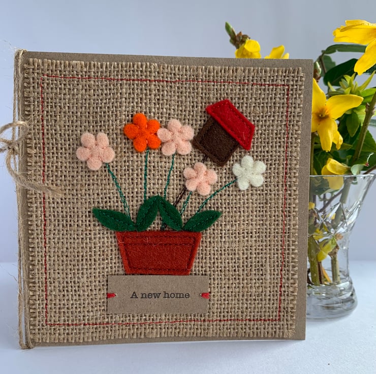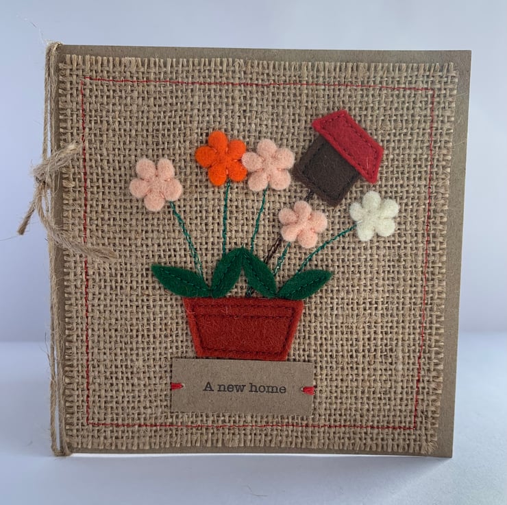 The hessian is machine stitched, using red thread, onto a plain brown recycled card. This stitching is visible on the inside of the card.