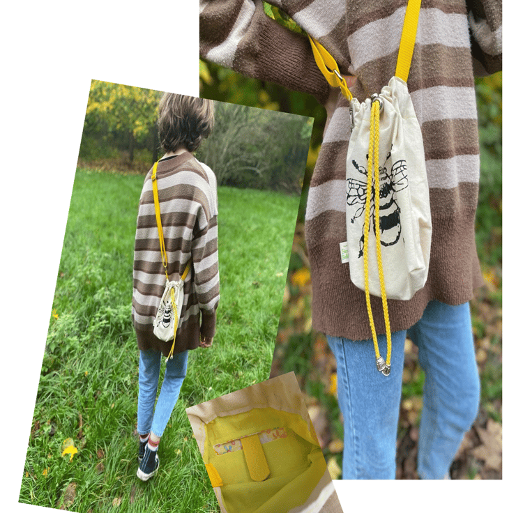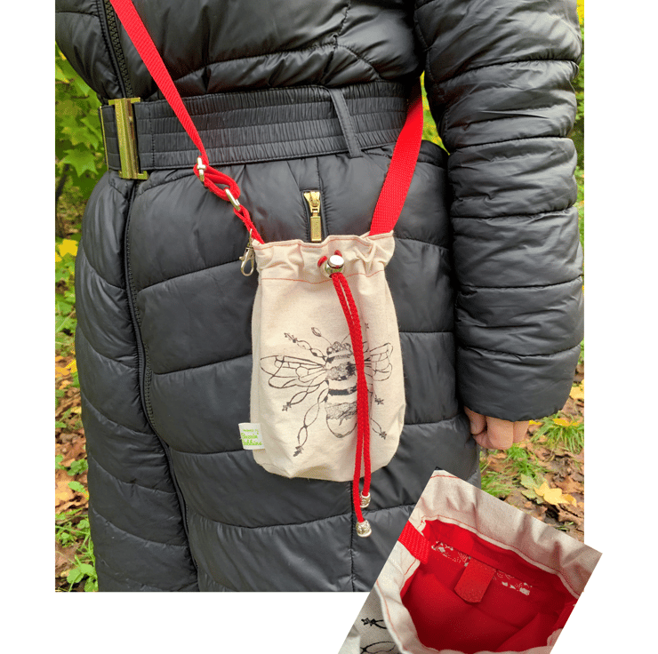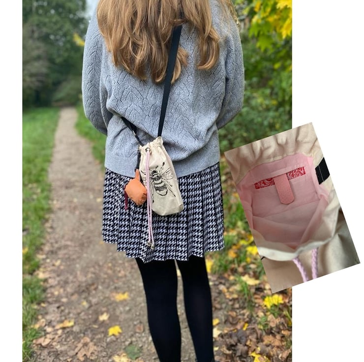 Splash resistant calico phone bag with bee print and colourful, adjustable strap and pull tie fastening; co-ordinating lining with patterned internal pocket. The strap has an additional claw hook for carrying extra items, eg. poo bags for dog walking.