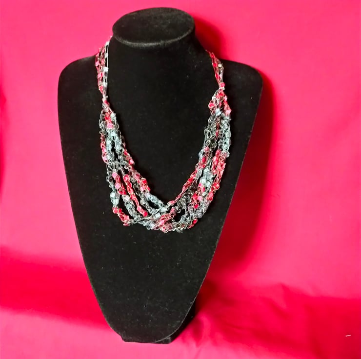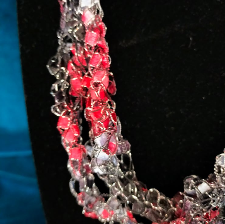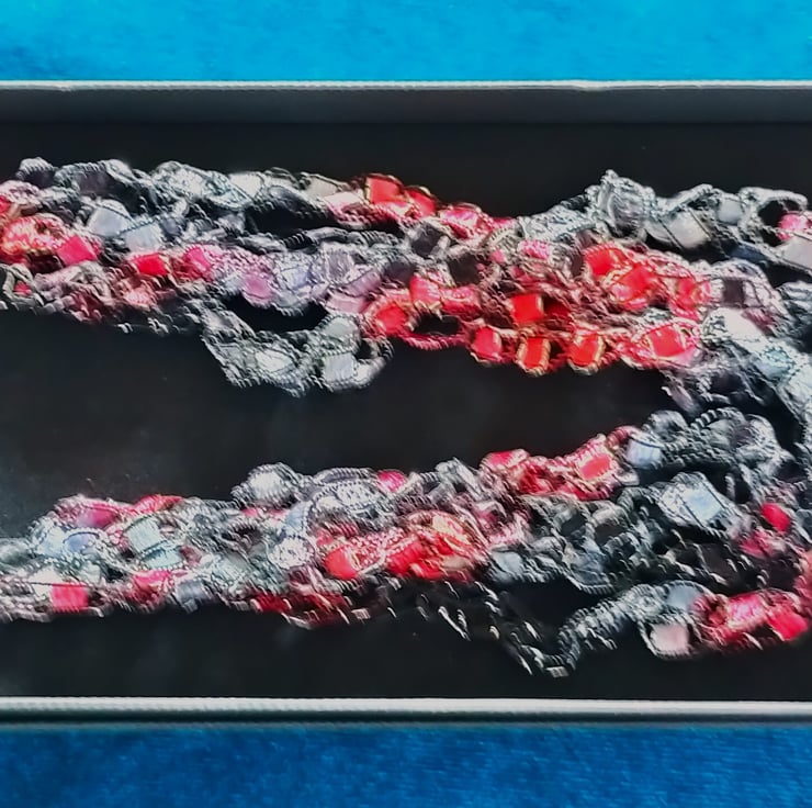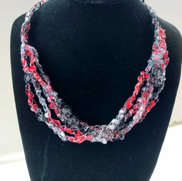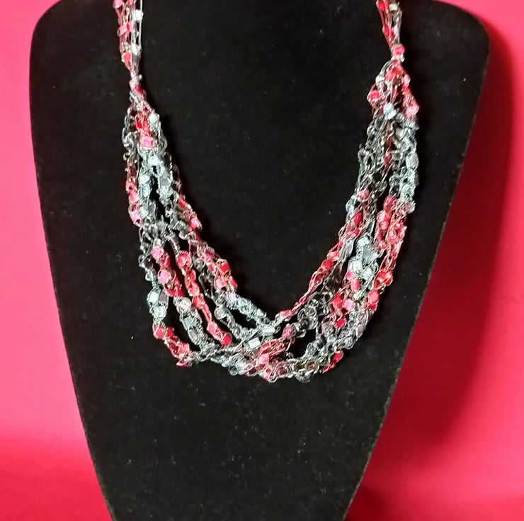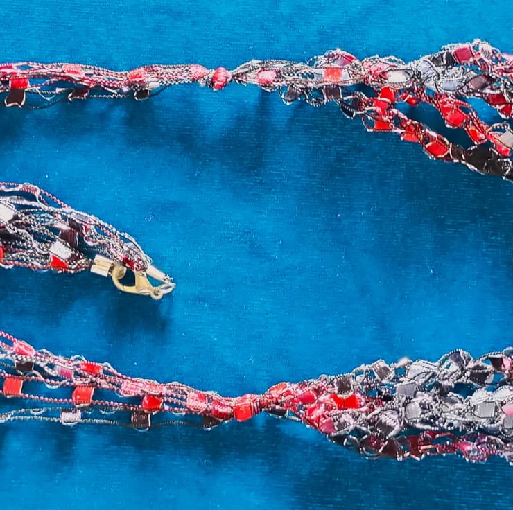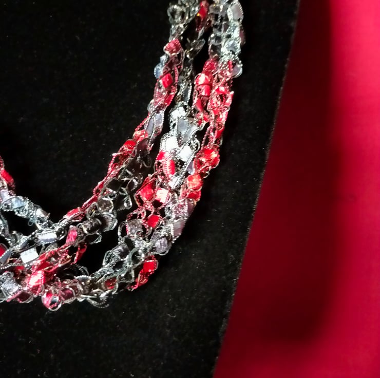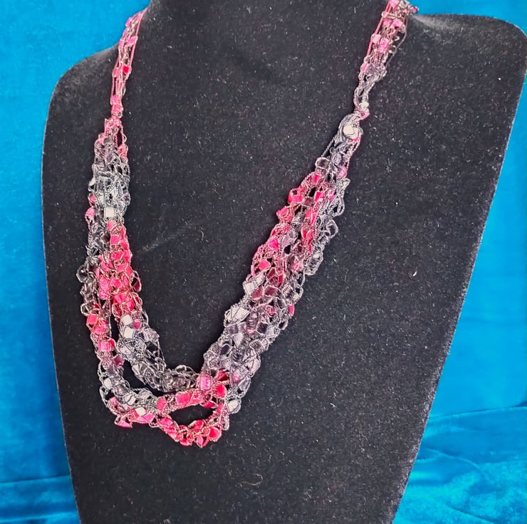 This lightweight, soft, handmade crocheted necklace is made from 5 strands of multi coloured ribbon yarn that are joined together and fasten with a lobster clasp.