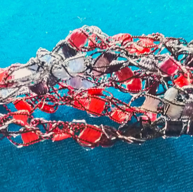 This lightweight, soft, handmade crocheted necklace is made from 5 strands of multi coloured ribbon yarn that are joined together and fasten with a lobster clasp.