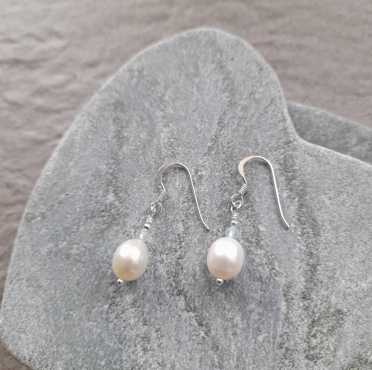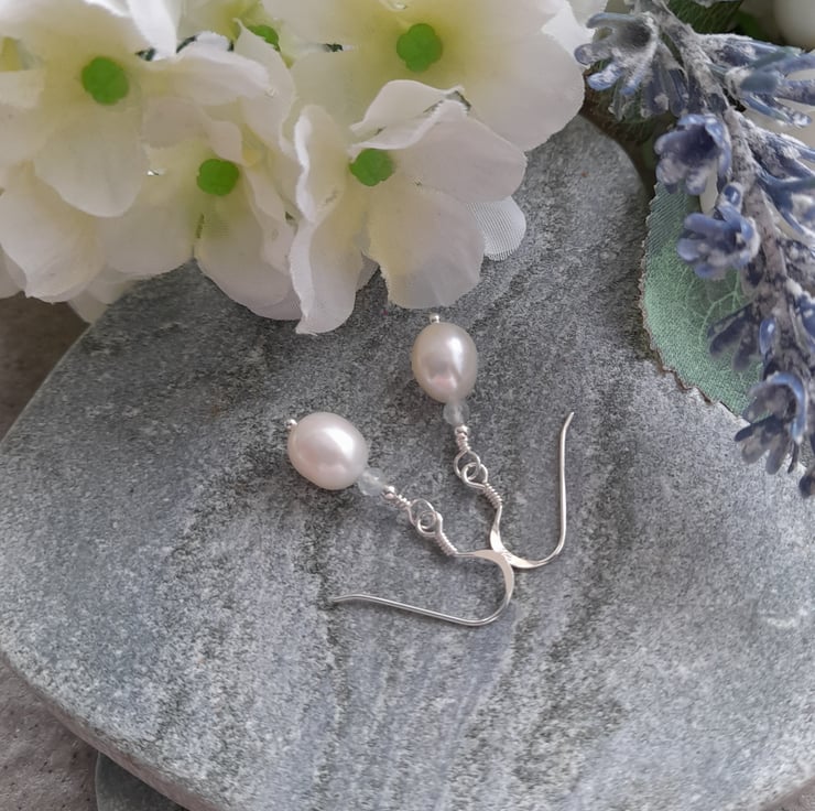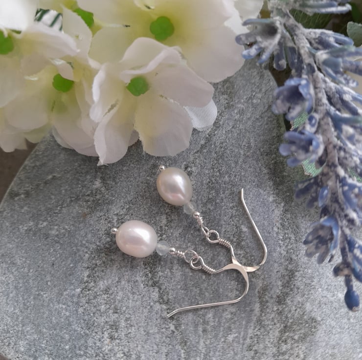Dainty white freshwater pearls with small aquamarine semi precious gemstones which are a very pale blue are attached to sterling silver ear wires.