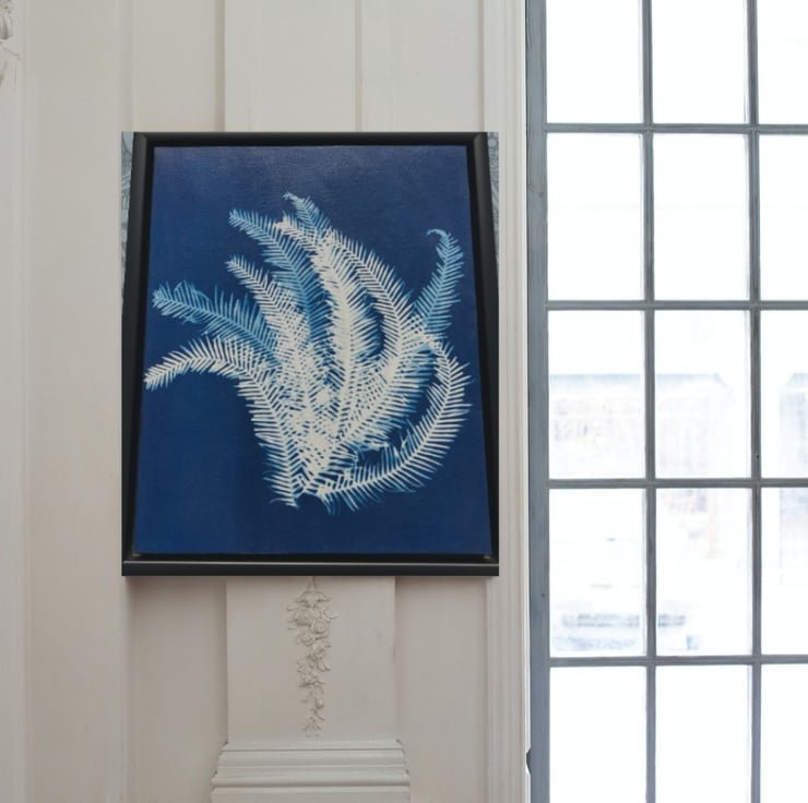 Original Art- The beautiful pinnate leaves of the Umbrella fern are captured here in a Traditional Cyanotype. By removing some of the foliage just before full exposure the blue colours are created, giving the piece depth and fullness. This eye-catching piece would adorn any room or hallway beautifully.