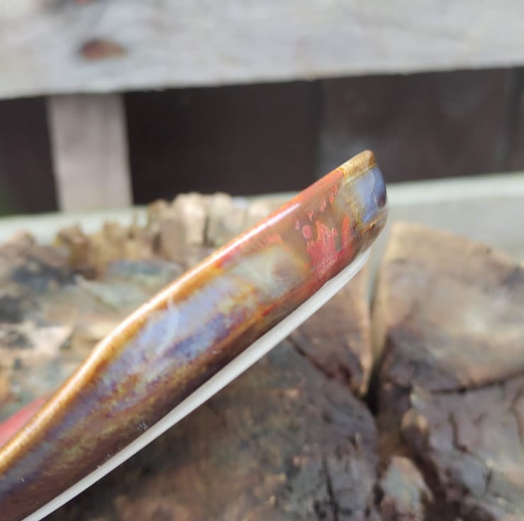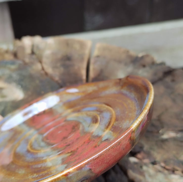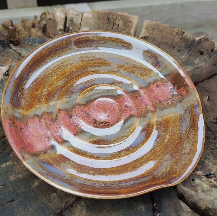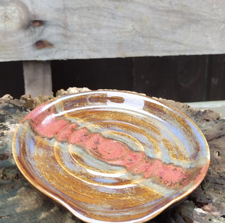 Spoon rest but could also be ideal for your used tea bags! This one came out more browny than I was expecting but love the copper centre. Has a slightly dropped corner where your spoon handle will rest. Fired to c1200 degrees (stoneware temperature) which makes things more durable than earthenware.