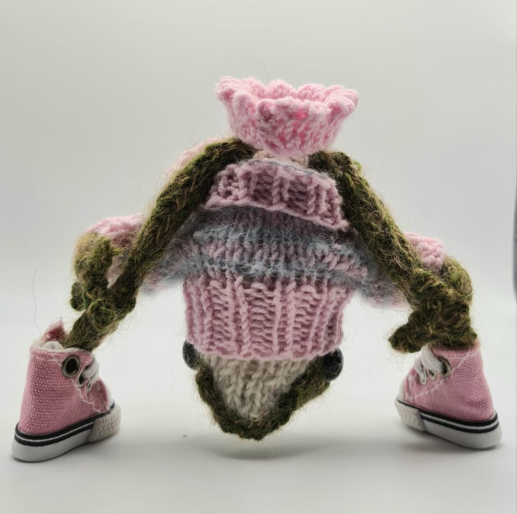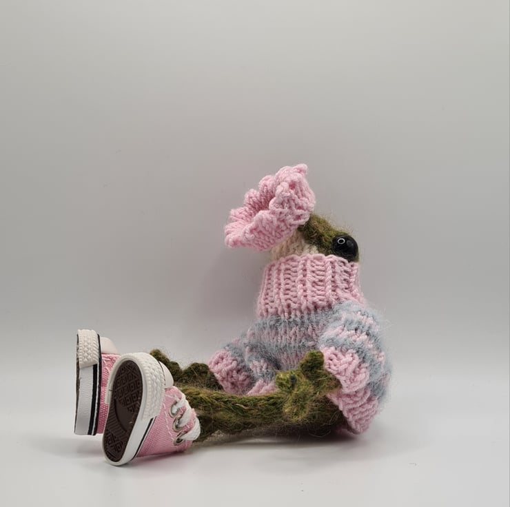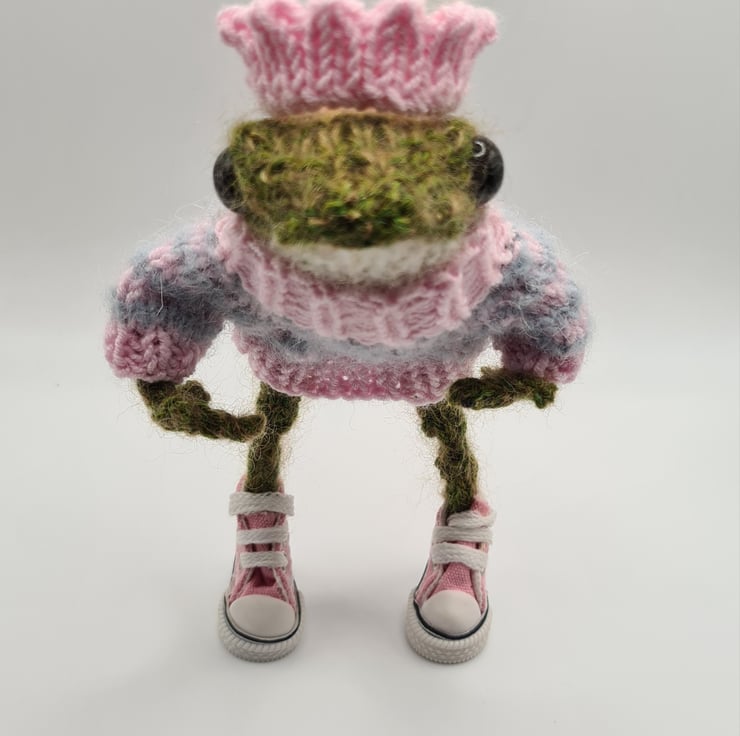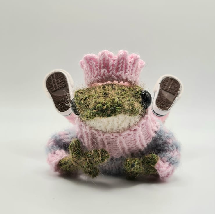 Hand knitted by me from the pattern by Dotpebblesknits a frog dressed in a cute pink and blue striped jumper with a pink crown and pink canvas boots. Froggy stands (with legs stretched out) at 7" long. The frog is made from 100% Alpaca, Kid Mohair and silk. The jumper is made from merino wool, Mohair and silk. All items are NOT suitable for children sue to small pats, internal wire armature and very fluffy yarn. I can also.make the completely vegan by using acrylic yarn. If you have an idea for different colours for the frog or clothing please do message me first and we can have an informal, no obligation chat. I will ship this using Royal Mail tracked.