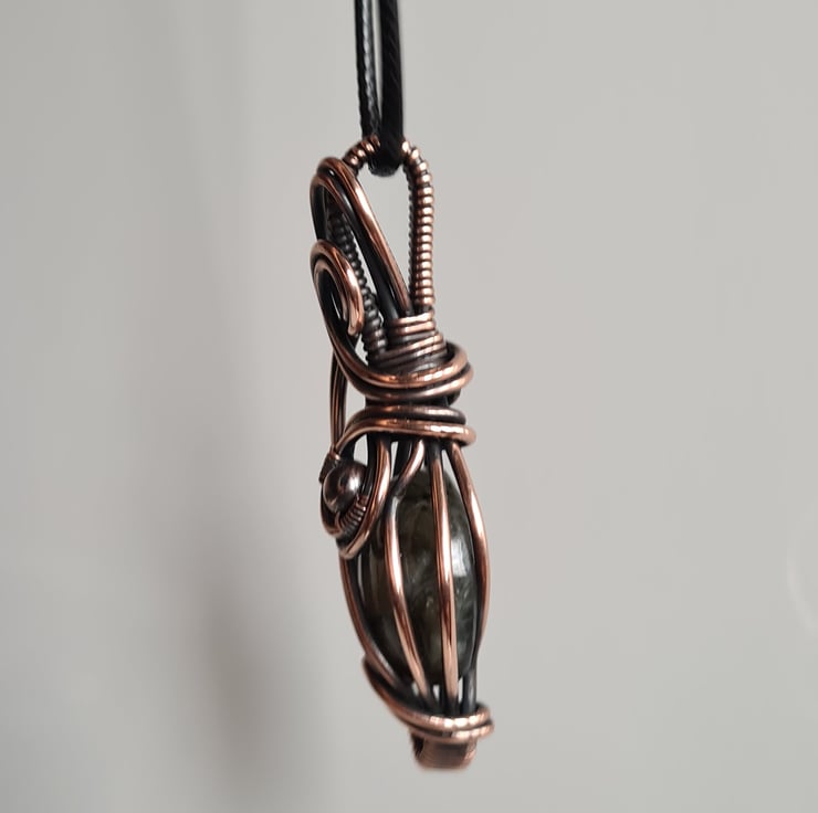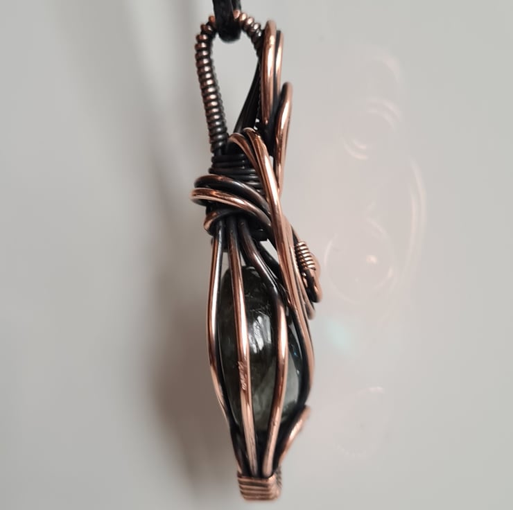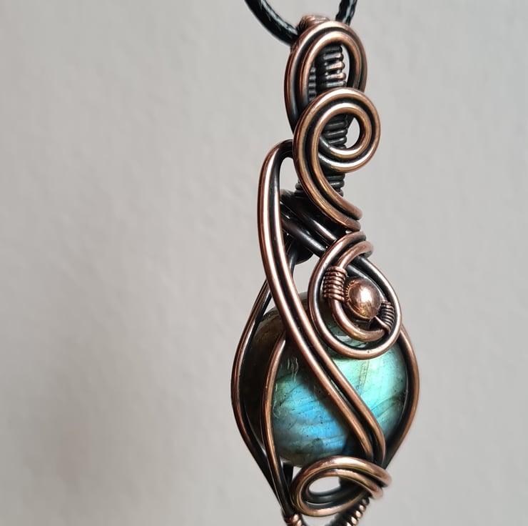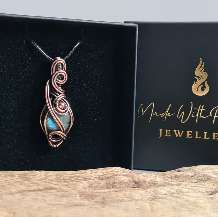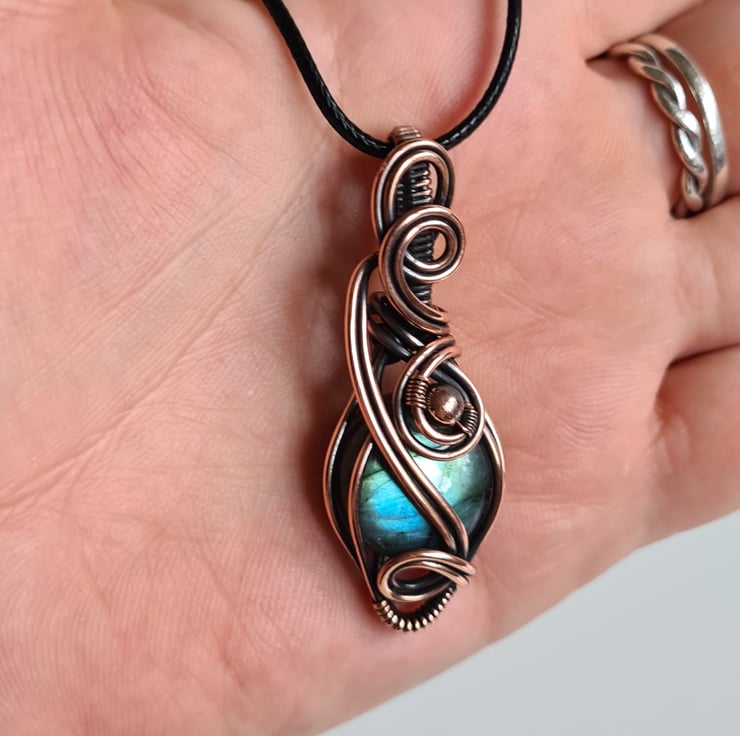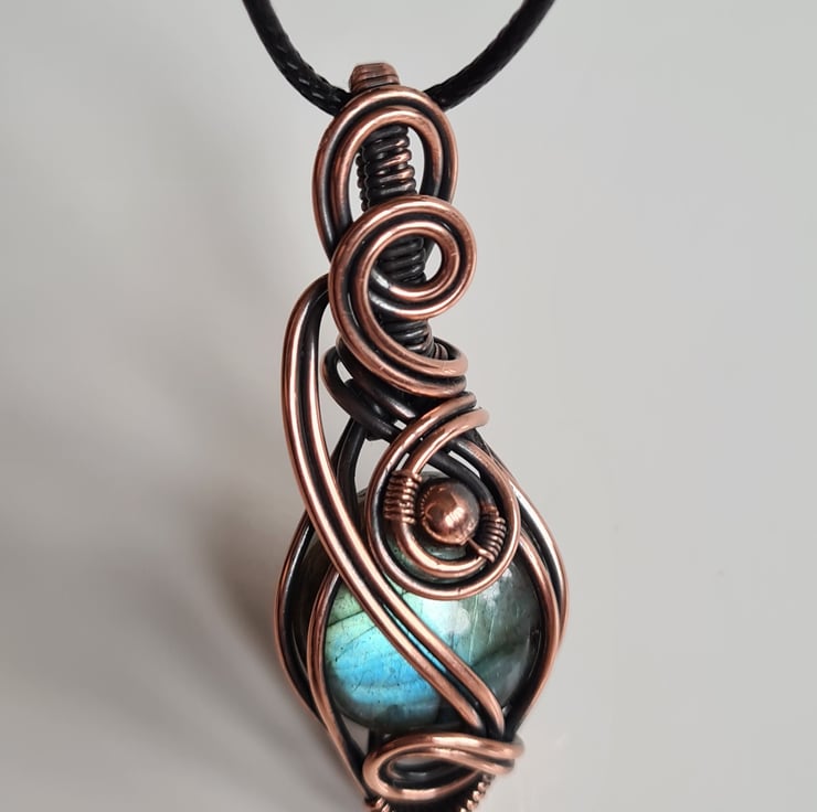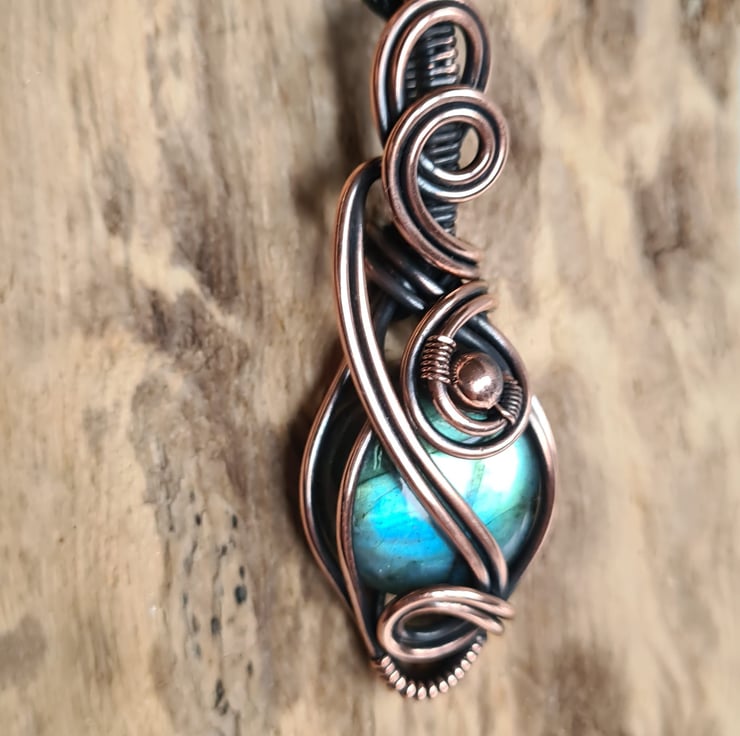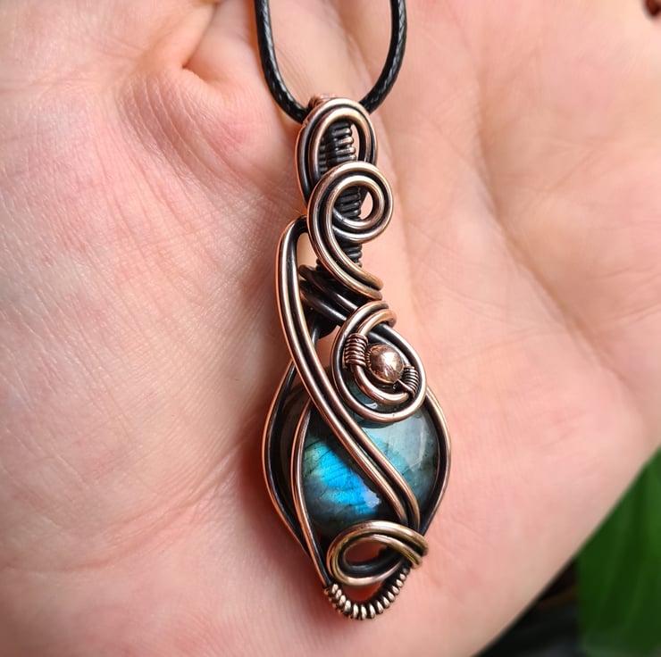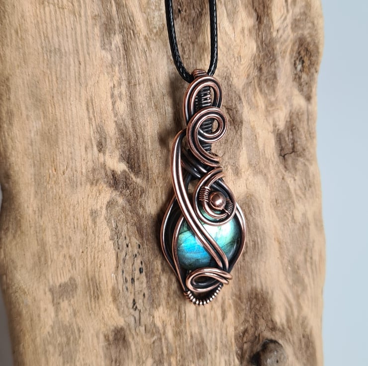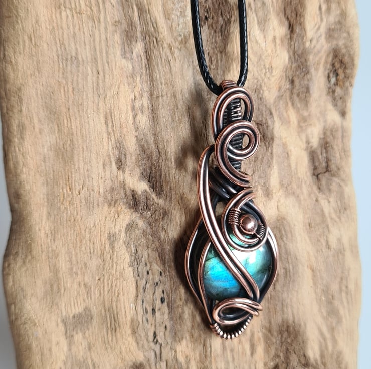 I have taken this stunning Natural Blue Labradorite and handwrapped it in raw copper, which I have then antiqued and polished for the final effect. The labradorite is a beautiful tone of blue, with plenty of flash and looks great teamed with the copper
