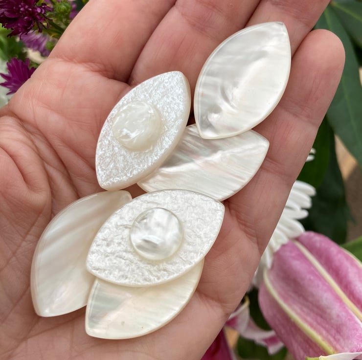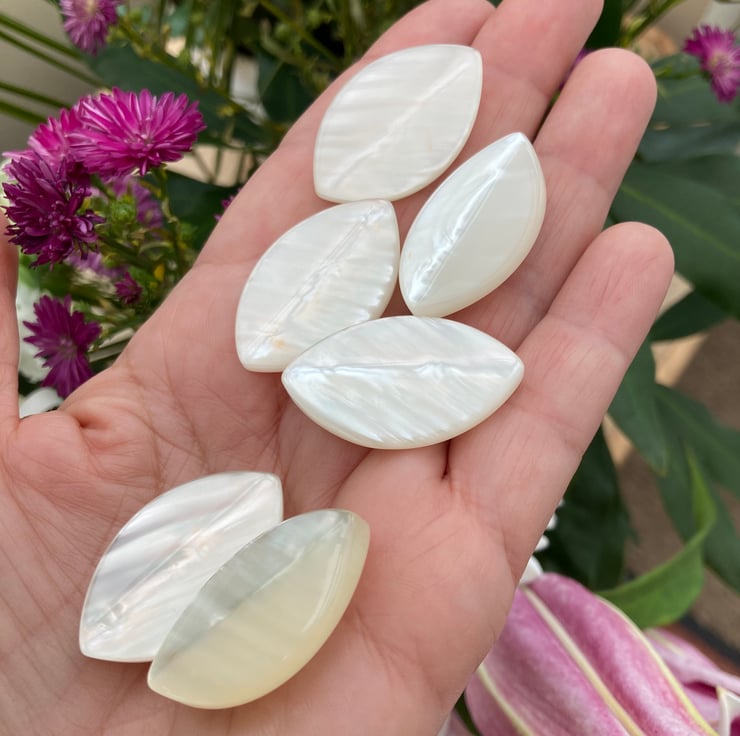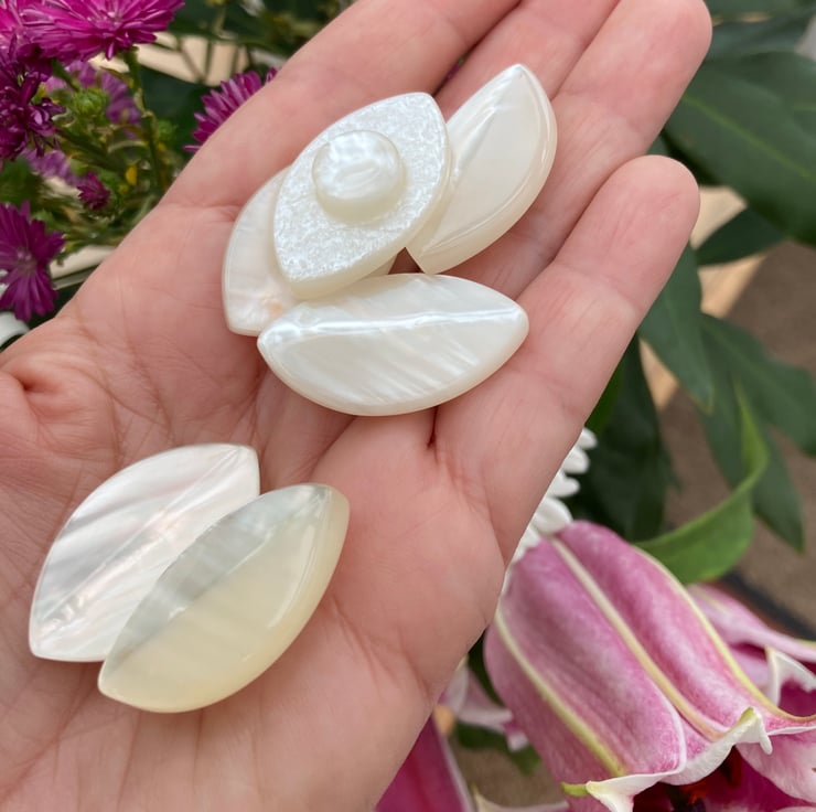 A set of 6 large pearlescent lucite vintage buttons, with a lucite shank, they rounded and slightly raised with a ripple effect to the front of the button, which catches the light beautifully and are flat but textured at the back.