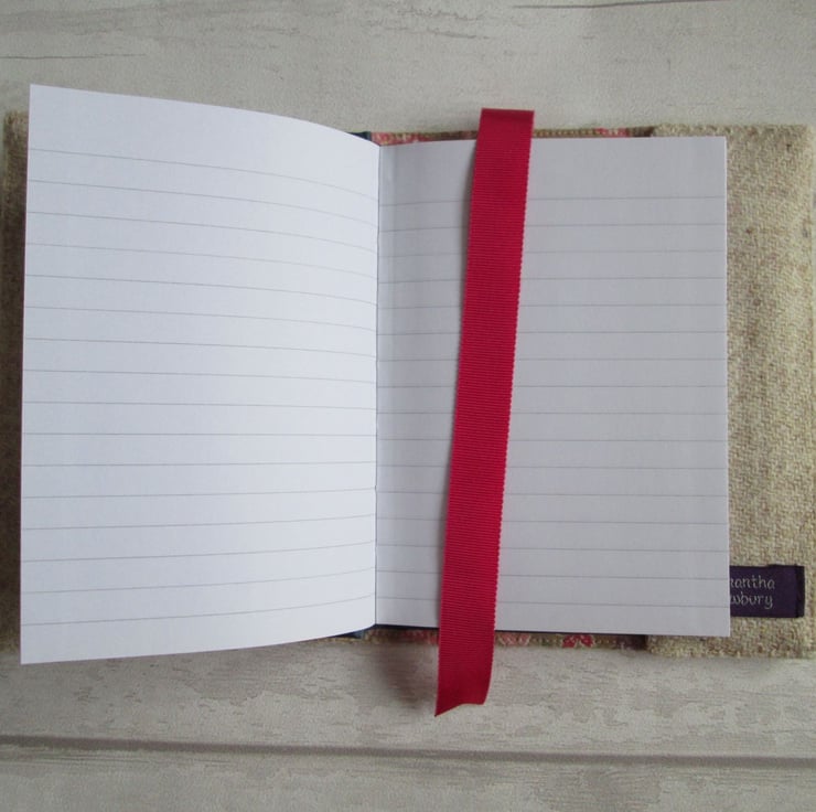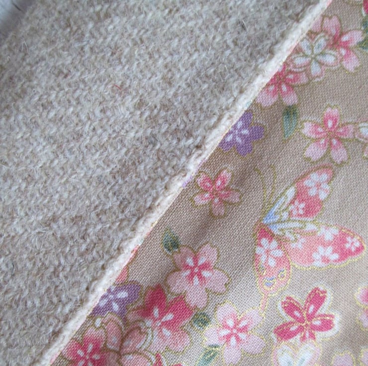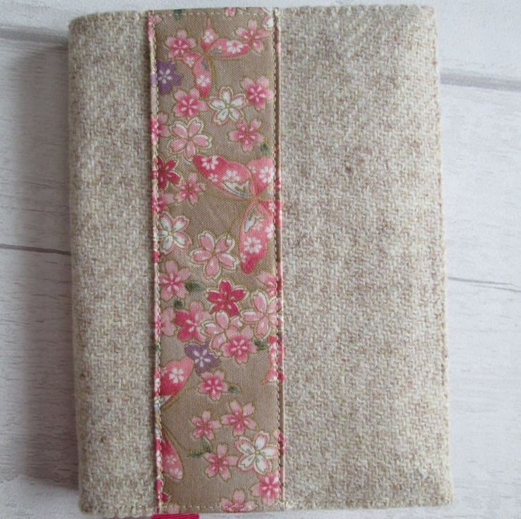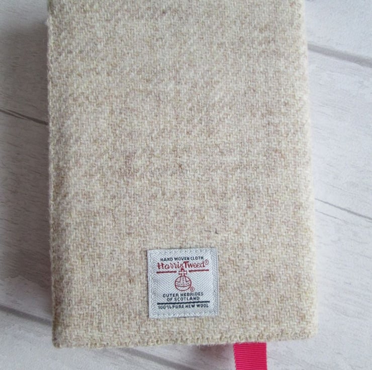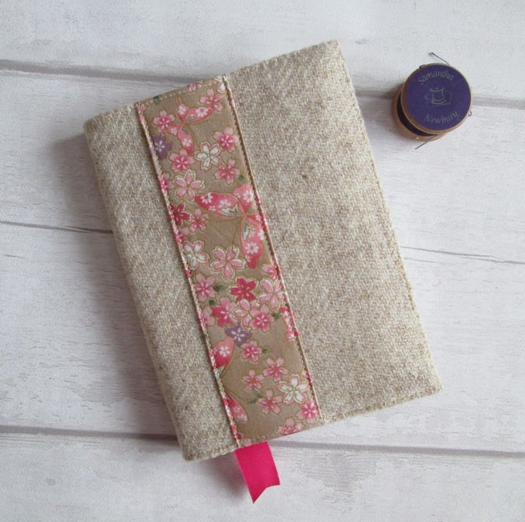 A beautiful creamy, oatmeal Harris Tweed, handwoven on the Isle of Lewis, has been used to make this reusable notebook cover. I've used a pretty Japanese style print of pastel butterflies and flowers on a gold background to make the feature band and lining, and incorporated a ribbon place marker. Completed with the official Harris Tweed 'Orb Mark' label on the reverse and ready to use with a lined A6 notebook, it would make a lovely gift.