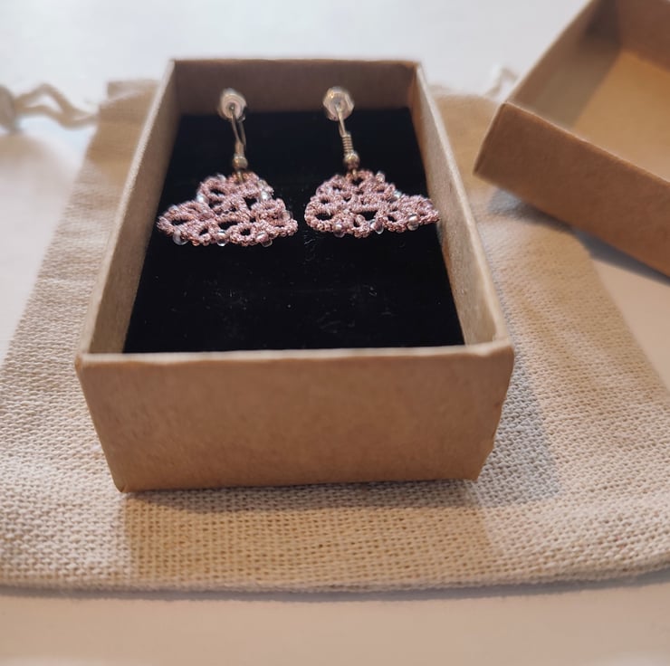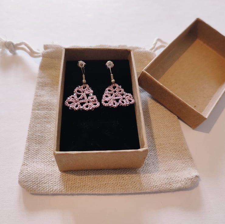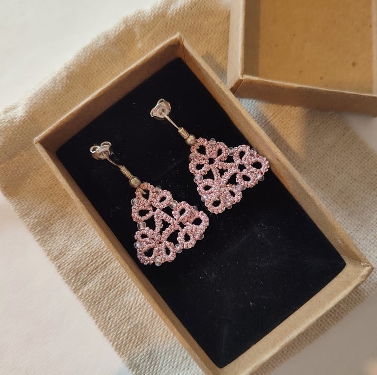 Tatted lace earrings made of metalic thread, glass beads and silver(925) beagles.