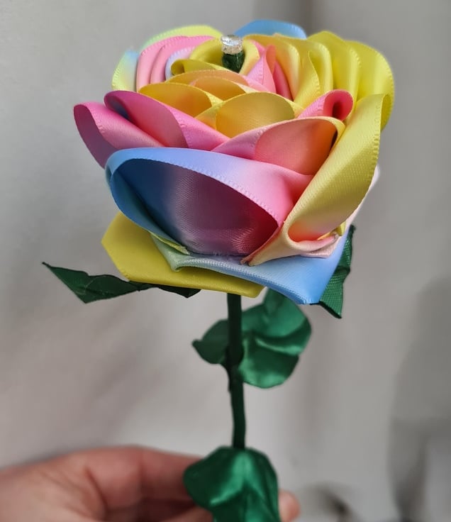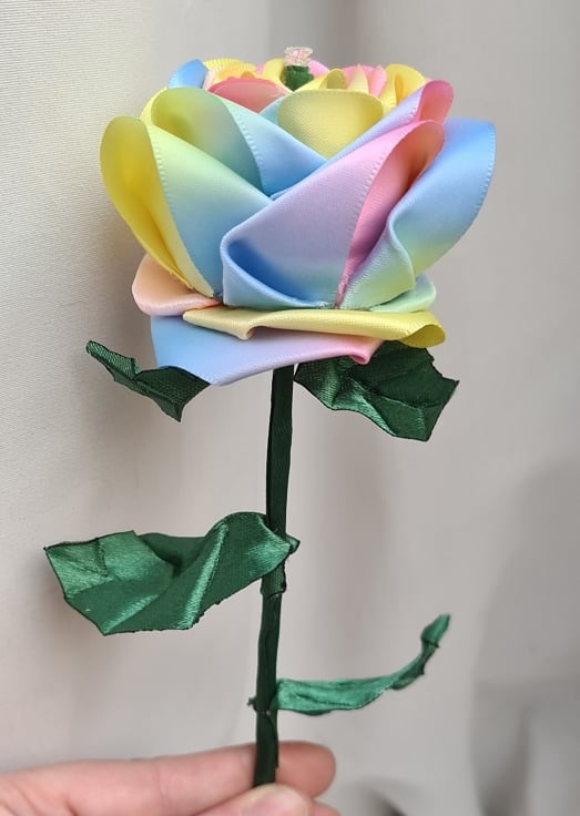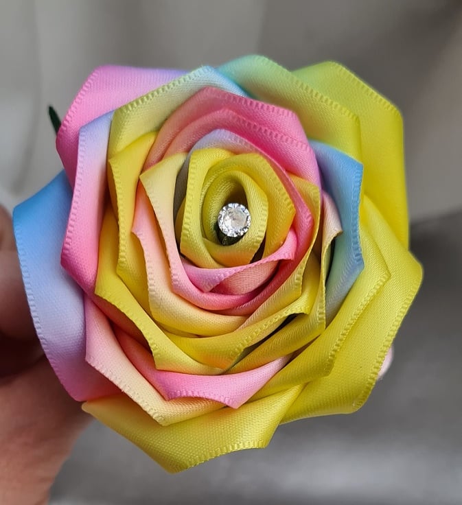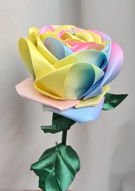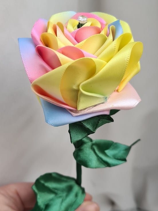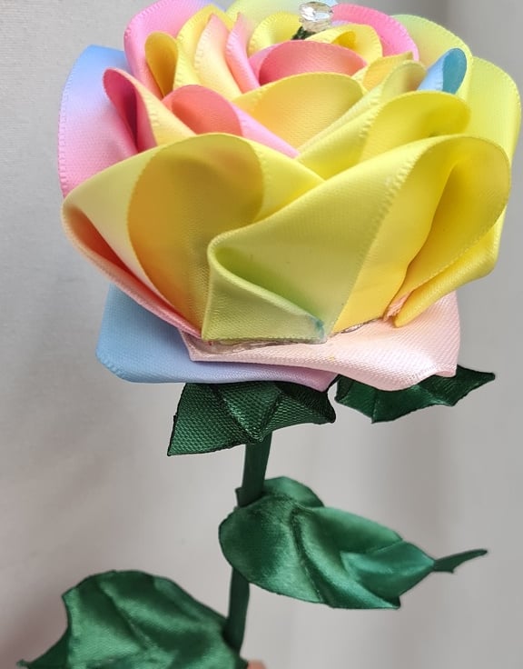 A beautiful handmade single stem rose (one flower only), made with a gorgeous multi-colour pastel ribbon in a colour referred to as Unicorn. This ribbon is so lovely, thick and high quality and is so fantastic to use to create beautiful things with. The stem is made from bamboo (Non-bendy) and covered with a Dark Green Satin (polyester) ribbon and the leaves are made from the same colour ribbon.