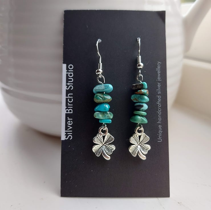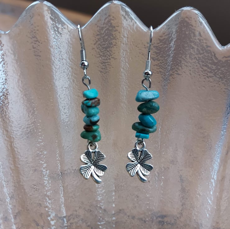 A great way to celebrate St. Patrick’s Day - these drop earrings feature semiprecious turquoise nuggets together with a lucky four-leaved clover charm. Shamrock is a form of clover long regarded as a symbol of Ireland. It usually has three leaves, not four, and was used by St Patrick in his teaching to represent the Holy Trinity.