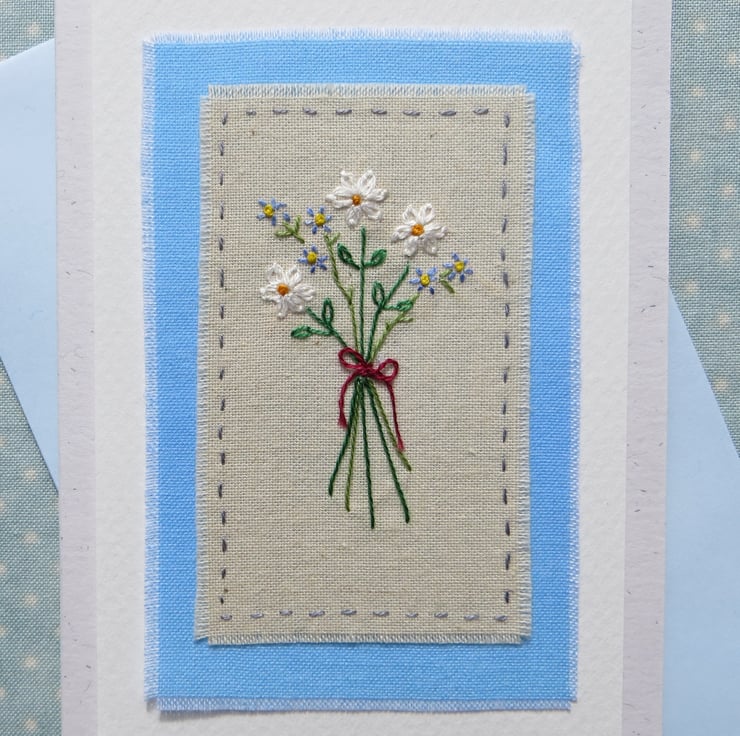 I love to sit with a needle and threads and stitch what comes to mind straight onto the fabric. This card was made that way. I have given the embroidery a lovely blue ground.