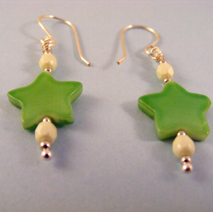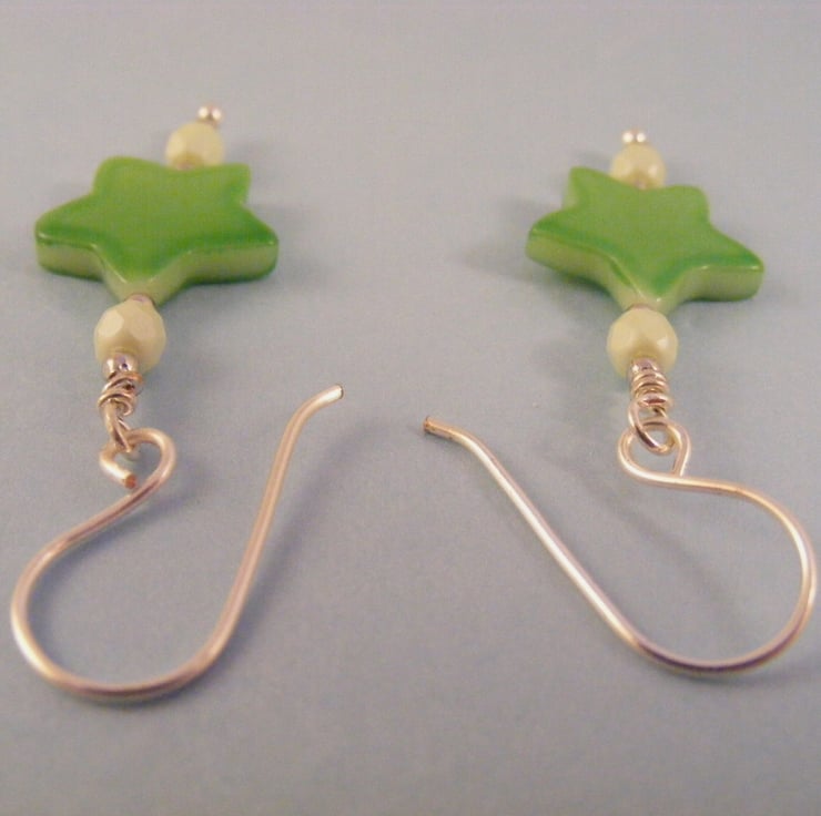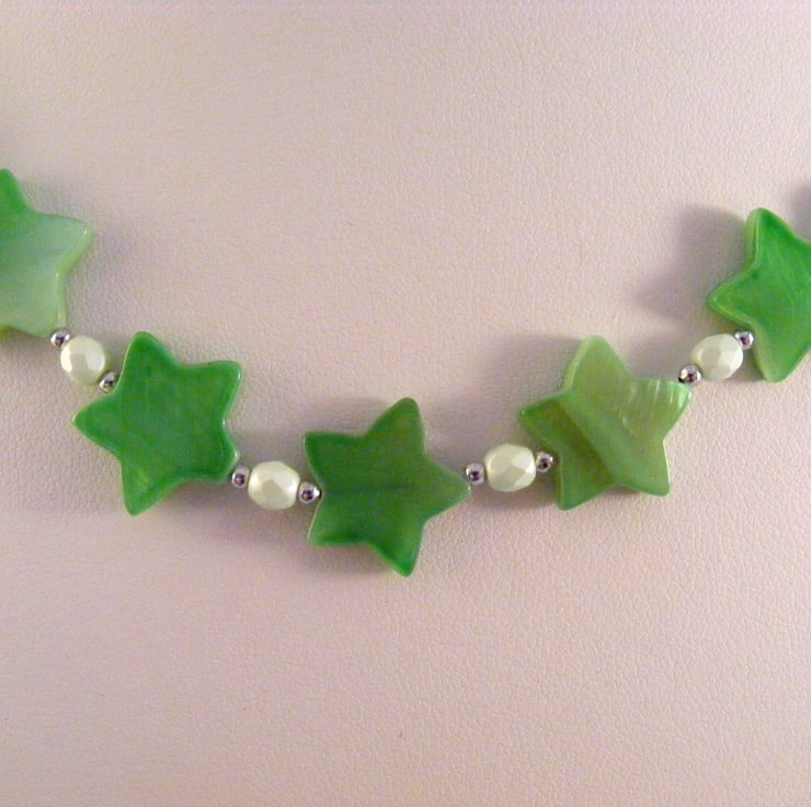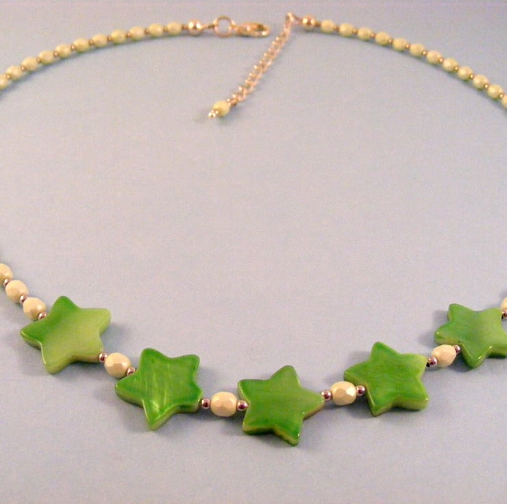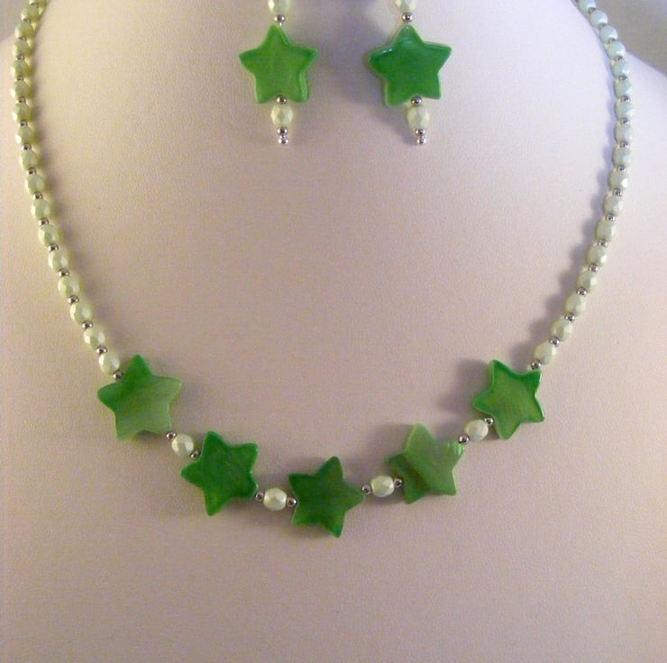 This lovely summery jewellery set includes a necklace with matching earrings. I've handmade the set with, 14mm green shell stars, 4mm mint green Czech firepolish beads, 2mm silver spacers, silver plated findings, beading wire, silver plated extension chain and lobster claw clasp. Ear wires are handmade with silver plated hypo allergenic wire.