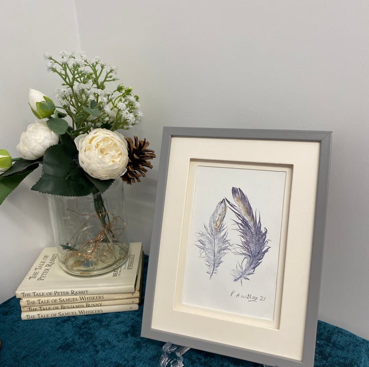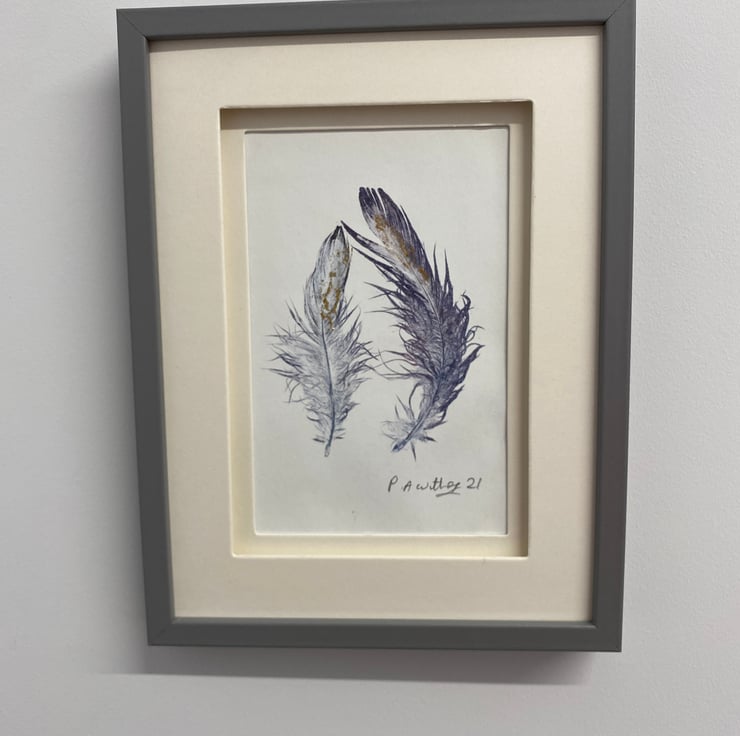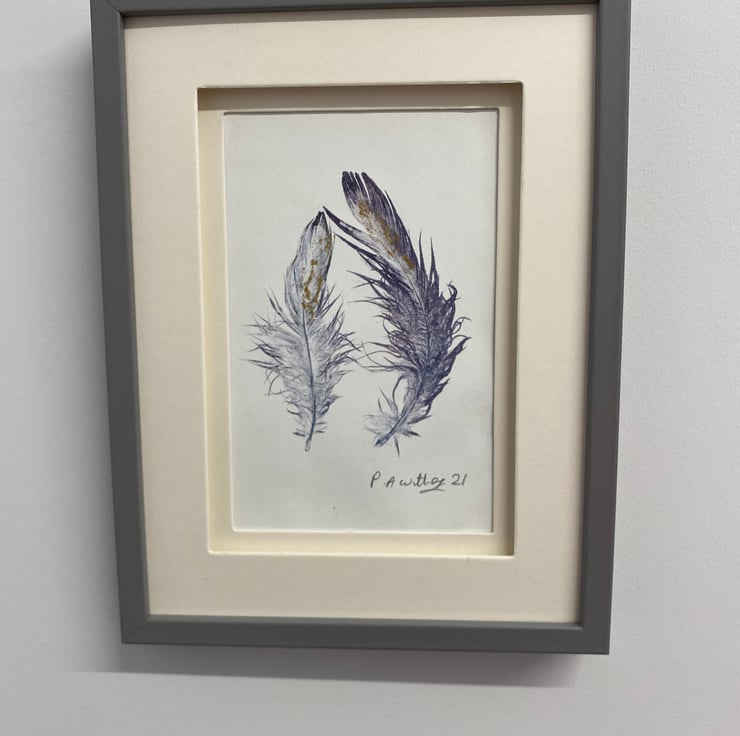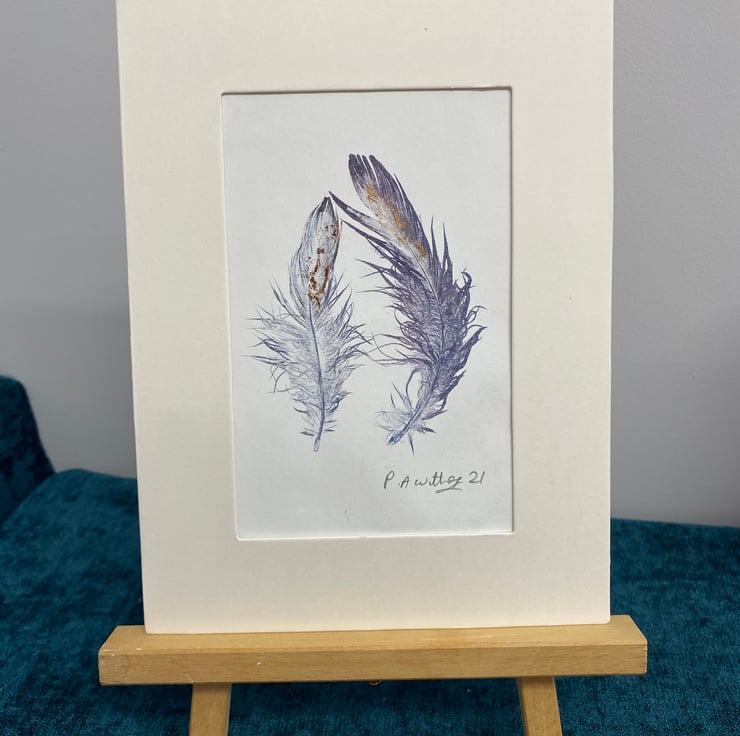 Each feather is inked using a mix of colours of intaglio inks to create this beautiful light blue/grey/lilac colour. The feathers are then hand hand pressed. Great care has to be taken to prevent clogging and to ensure each tiny strand shows. This print has added detail of good leaf.