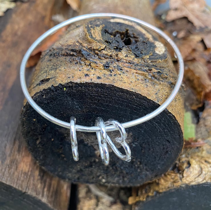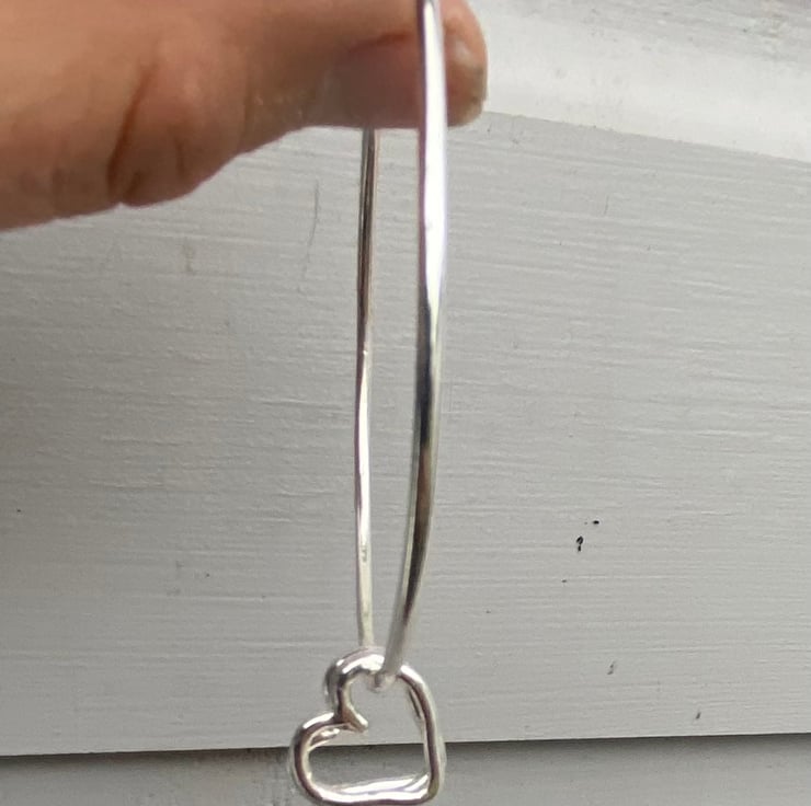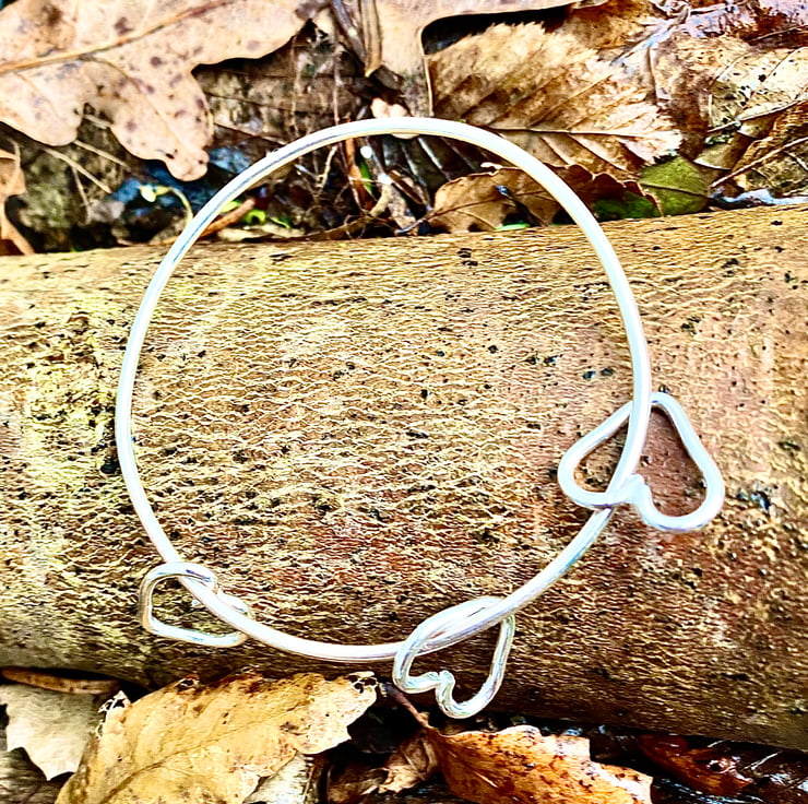 Handmade from 2.5mm round solid silver wire with 3 sliver wire hearts. As the hearts are handmade, no 3 are the same.