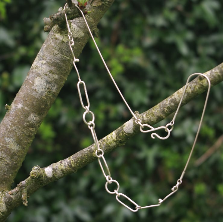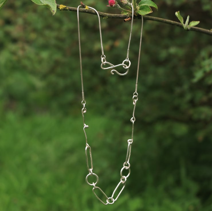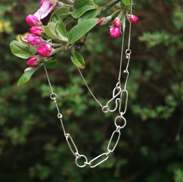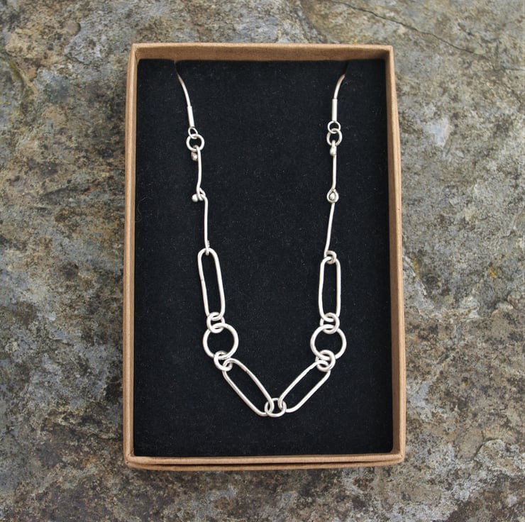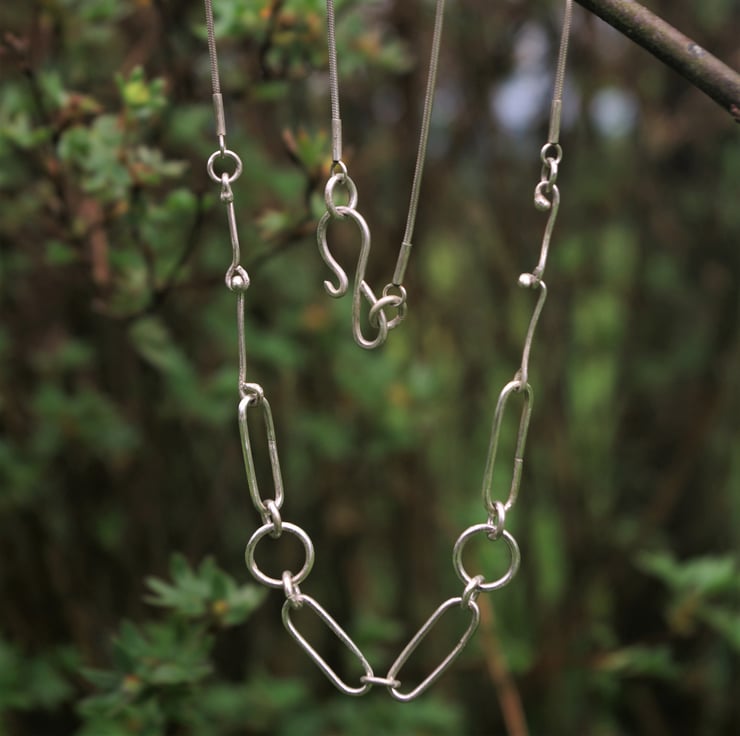 An eco sterling silver necklace sitting neatly on the neckline, as a statement piece of jewellery which is also delicate in nature. There is a mix of paperclip chain /elongated links and circular links , which are placed symmetrically. These are all handmade with eco sterling silver and soldered closed.