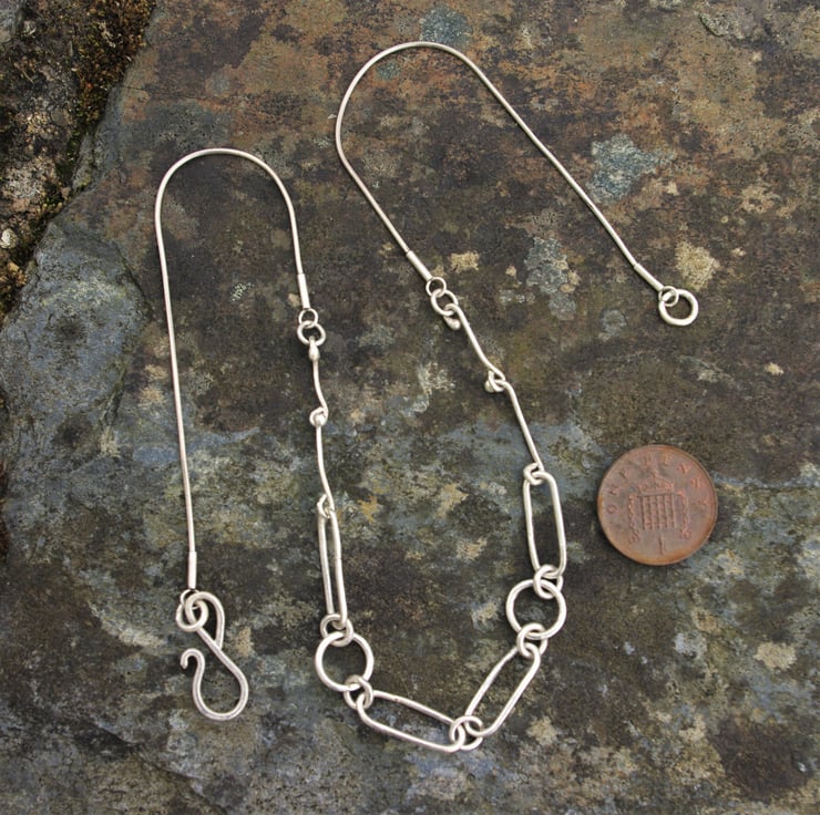 Short lengths of silver wire threaded through a loop, make up the back part of the chain together with fine, good quality sterling silver snake chain.