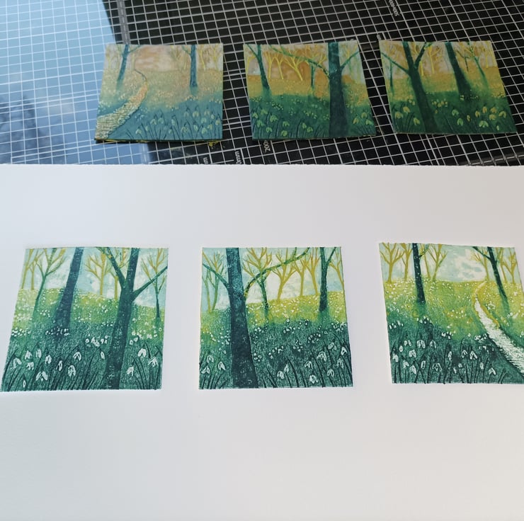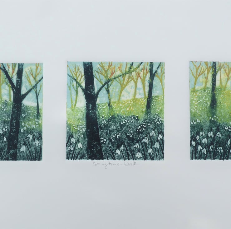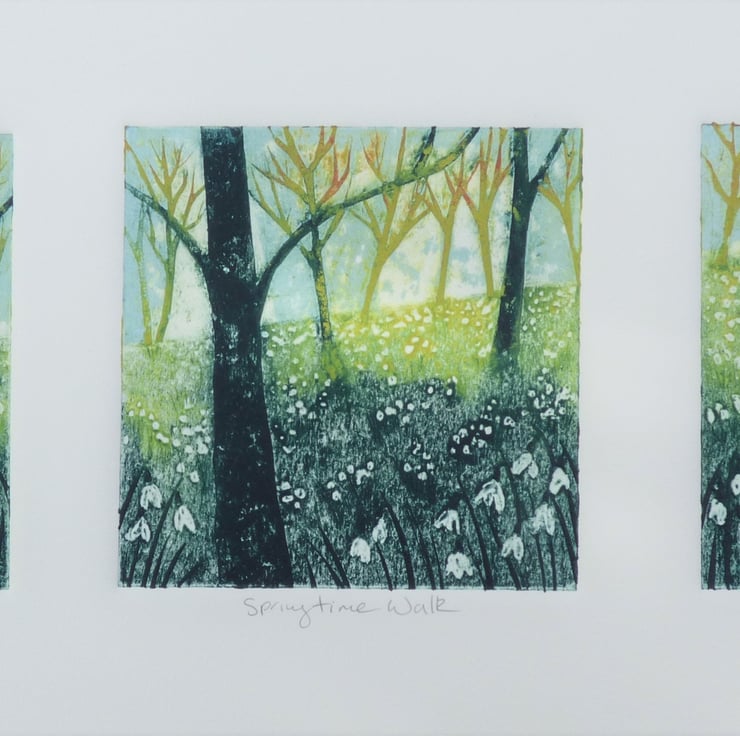 A hand printed Collagraph print of a Spring landscape. This print was inspired and created from drawings on my walks in the Cotswolds this Spring. Its always exciting to see the Snowdrops, as they mark the beginning of Spring.
