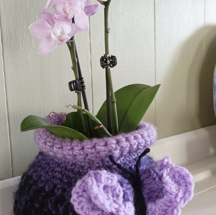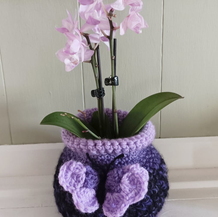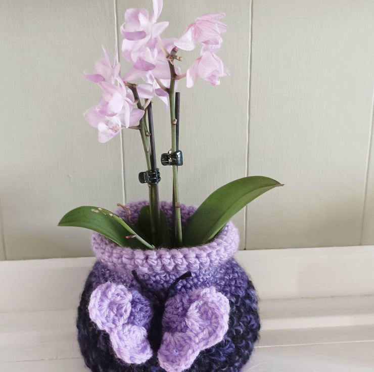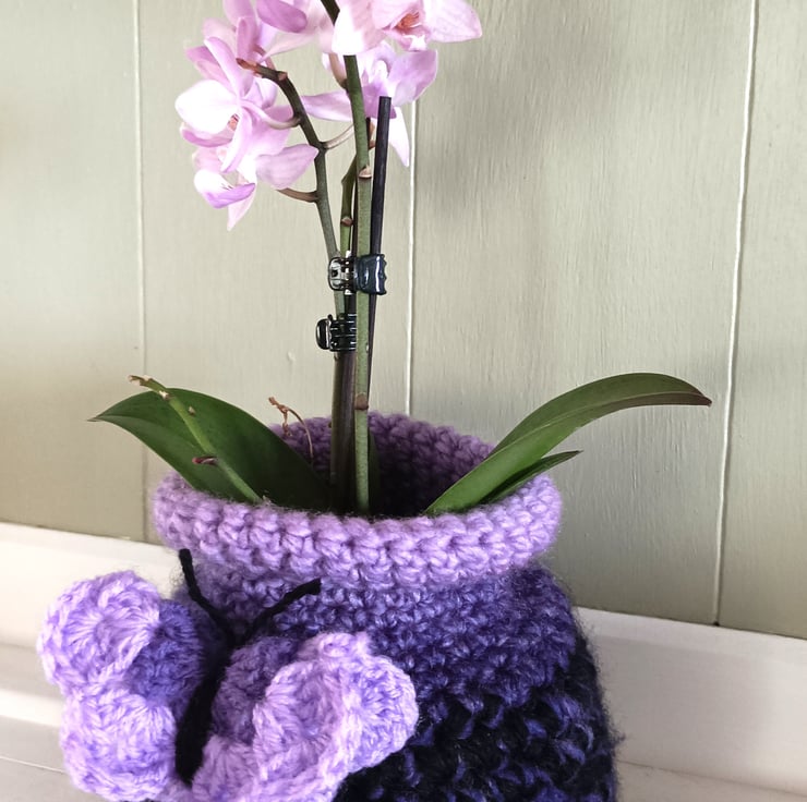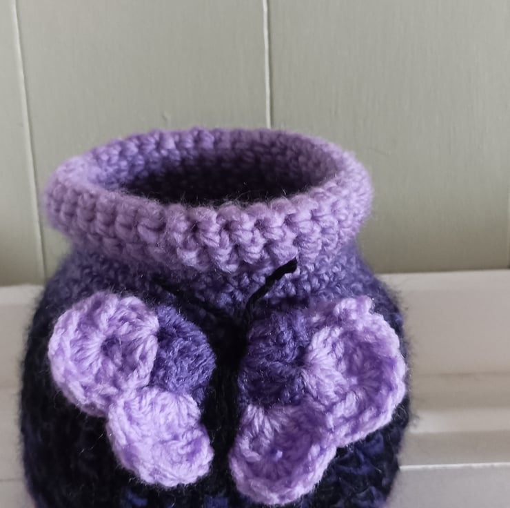 Hand crochet Vase with a 3d crochet butterfly. Made using a super chunky self patterning colours and another yarn.