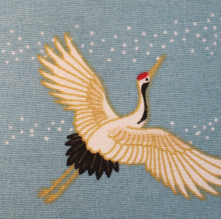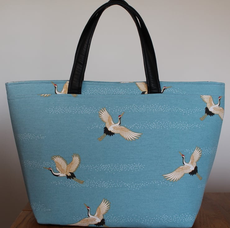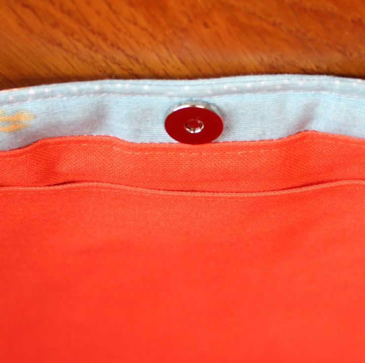 I have made this handbag from a lovely cotton canvas fabric in pale blue with stork print, I have lined the bag with a coordinating orange cotton canvas lining with a slip pocket.
