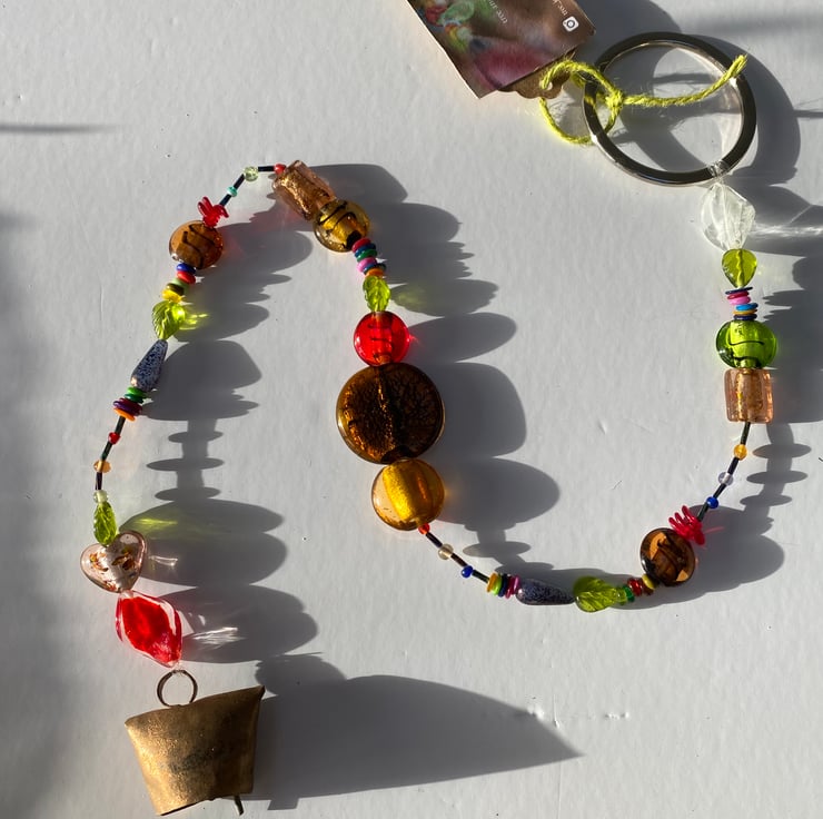 My works are designed to be placed Indoors from a window or outdoors hung from a branch etc to allow the glass beads to be illuminated by sunlight. Over time, exposure to the elements allow the tin bells to acquire additional texture that adds to the organic, earthy appearance of the pieces. This would make a lovely gift for anyone that loves sparkles. They look fantastic in the Garden or I had one large commission to hang inside from oak beam. The photos do not do these justice! Stunning - 60cm long (all my designs come in different lengths, the photos can be deceptive as this is a longer piece! code KR1010