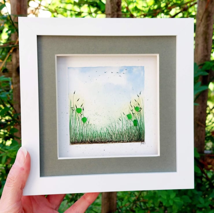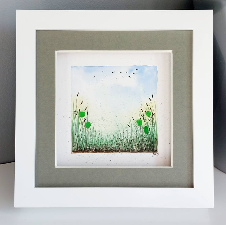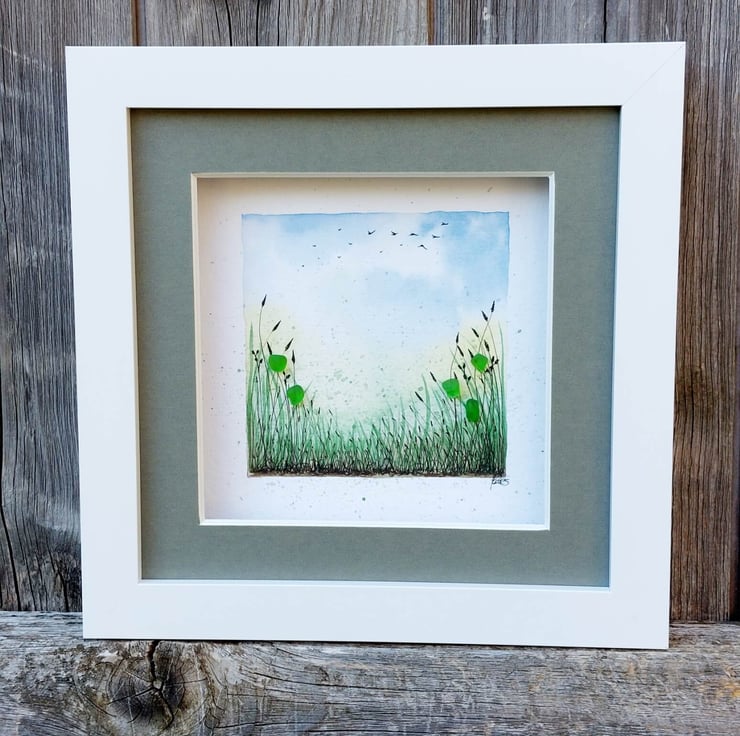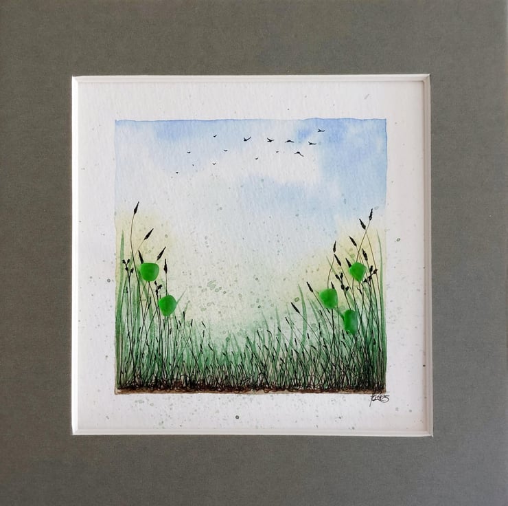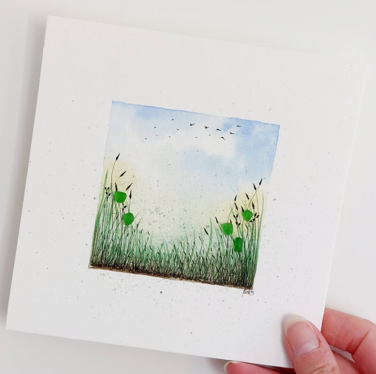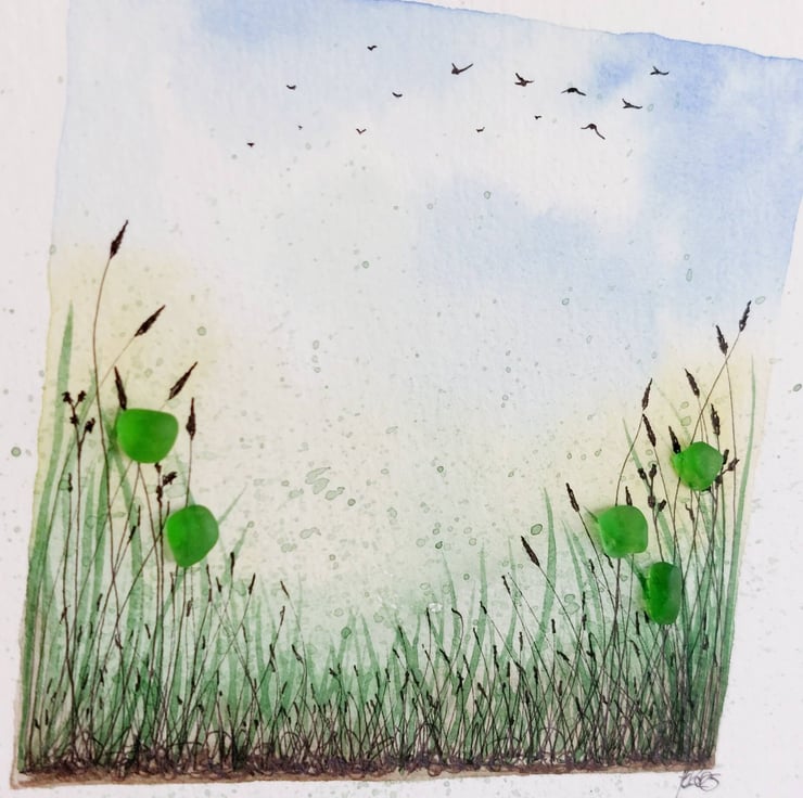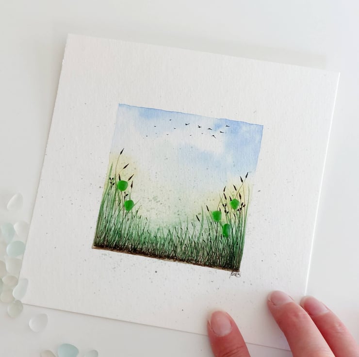 The time of year when the summer meadows come out is a beautiful one. Flower fields are stunning and the shapes of wild grasses inspire me, the remind me of lazy, warm summer days. The addition of the sea glass sets it apart and if you like sea glass and original watercolours, then I think you will love this :)