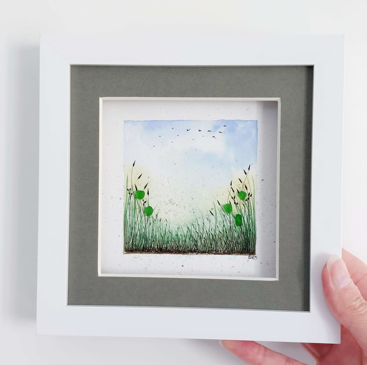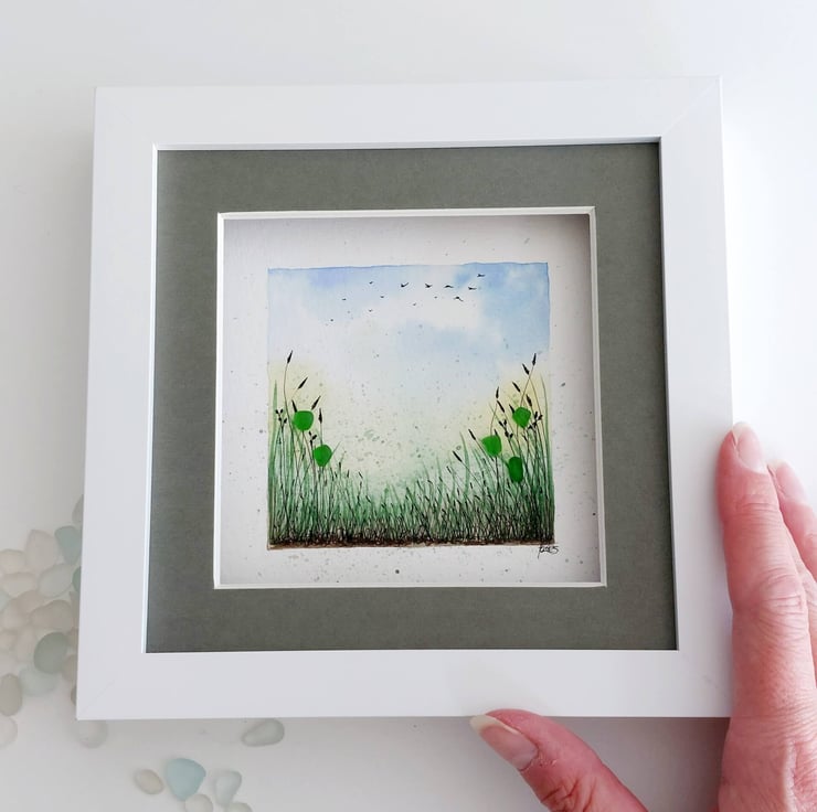Bring a touch of nature into your home with this Hand Painted Watercolour Grass Meadow artwork. The piece is elegantly framed and accented with unique green sea glass details, making it an ideal housewarming gift or a delightful addition to your decor. With an aperture of 10cm and a frame size of 17.5cm, it adds a unique charm to any space. Featuring a stand on the back, it’s perfect for displaying on a desk or bookshelf. The white frame with a grey mount complements the soft, hand-painted watercolour background, making this a one-of-a-kind treasure.