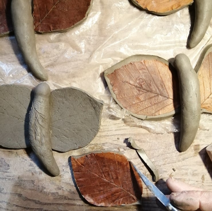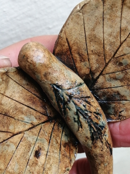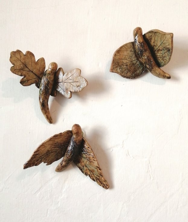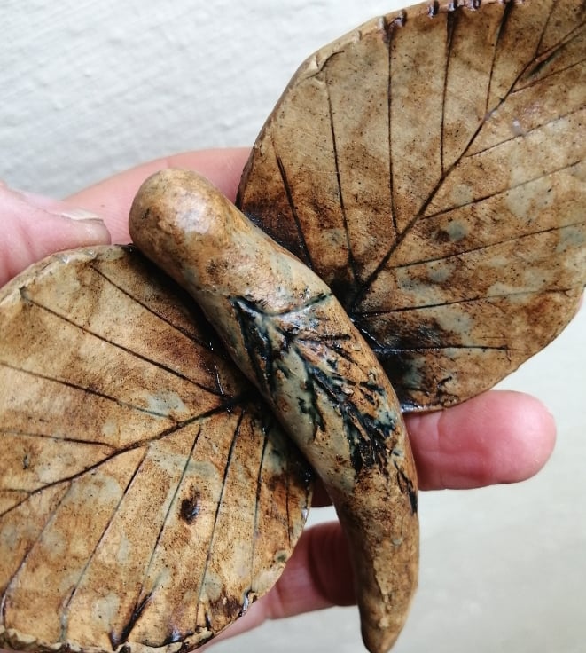 The wings of this Nature Sprite have been made from impressing the leaves from the Common Lime tree, and pine fronds from my garden, when the clay is still wet.