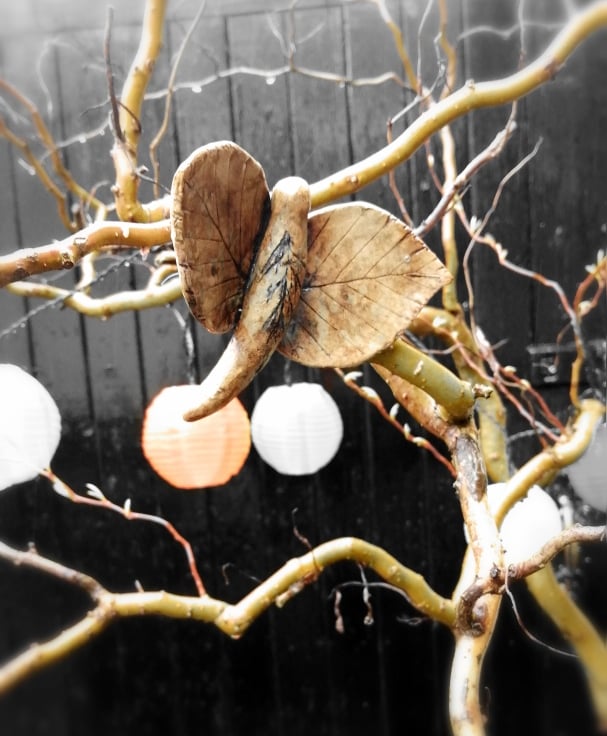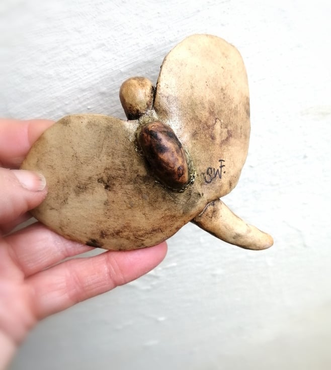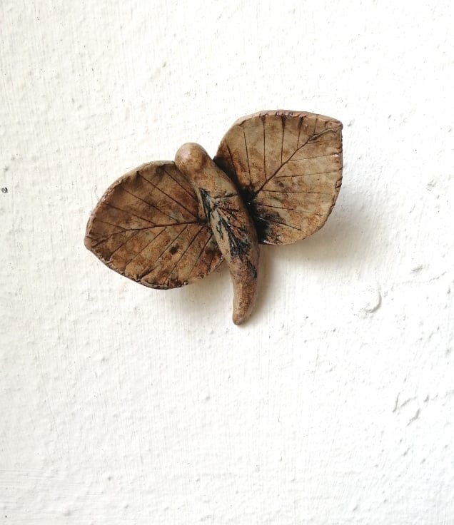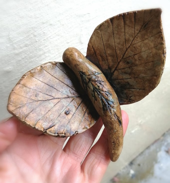 This ceramic Sprite has been created from Stoneware clay, using found leaves from the Common Lime tree that grows locally., to create the wings.
