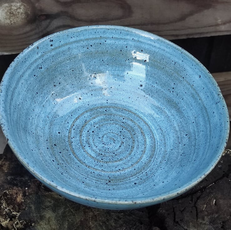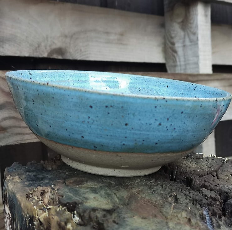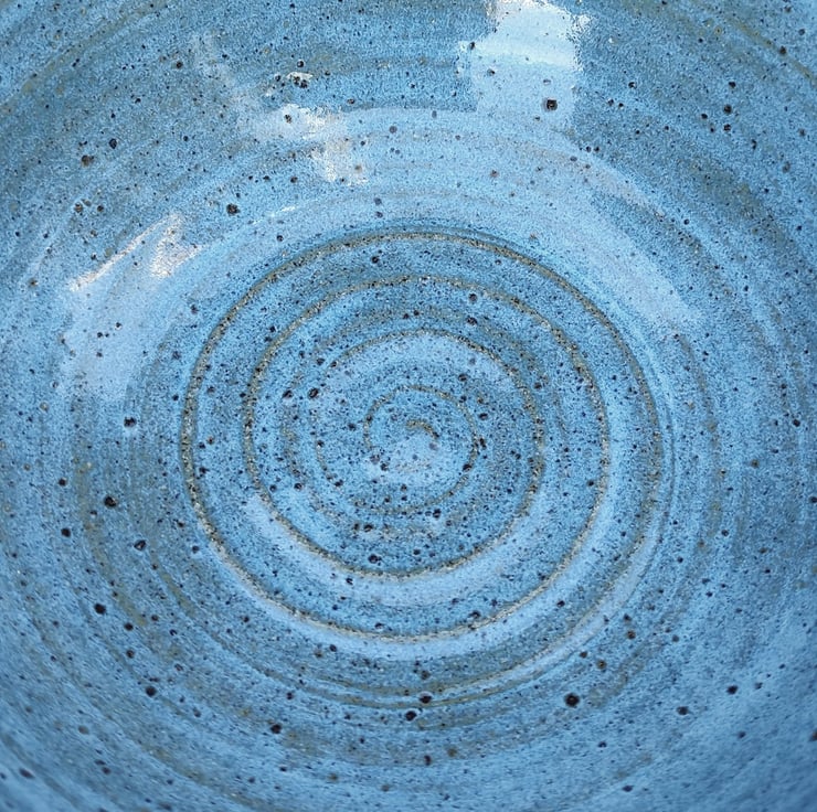 Have used a flecked clay with a bit of texture and love the toasty colour it comes out as when it's fired. Tricky to show its colour in the photos as the camera doesn't quite show it exactly but it's a Scandic blue, almost duck egg blue coloured glaze through which some of the flecks in the clay show. I also love having the bottom edge of the clay exposed...great to get the feel of the clay. Perfect as a snack bowl - for sweeties, crisps, dip or just as a bowl to look at! Fired in a kiln at a stoneware temperature (c1200 degrees) makes it durable and each one comes out of the kiln looking slightly different.