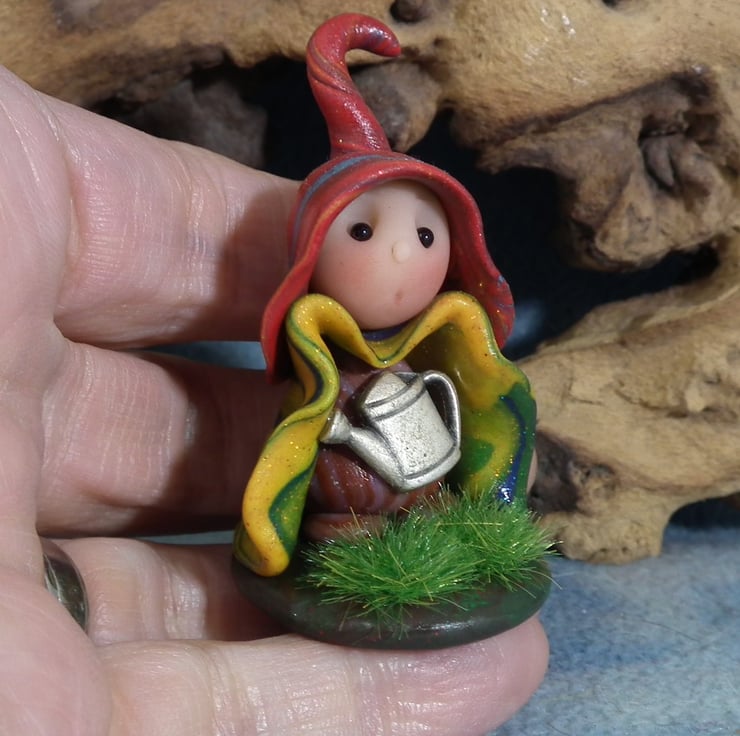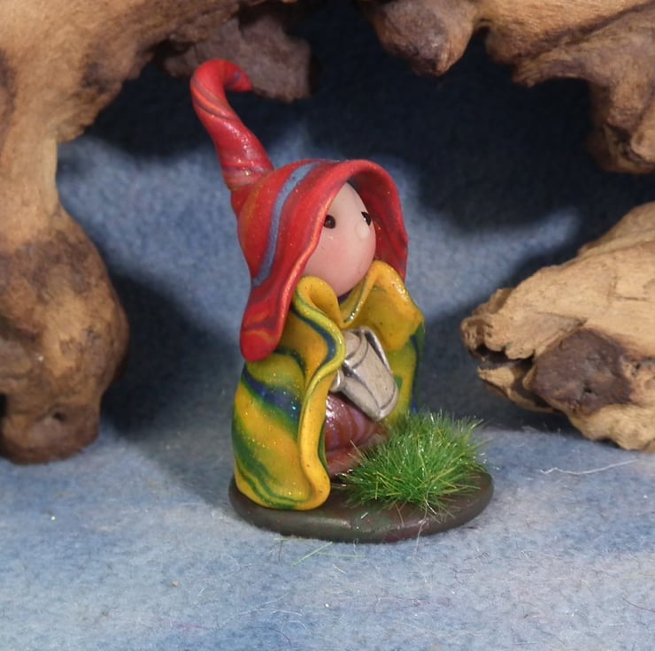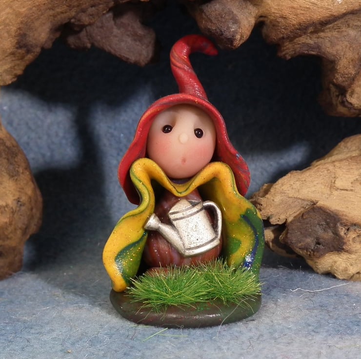 This is a 'one of a kind' creation having been entirely handmade without the use of moulds here at my studio on the Sussex Coast. Modelled with artist blend polymers, blushed before sealing with lacquer and featuring sparkling black onyx eyes and variegated robes. This Meadow Gnome is just one and a half inches tall.
