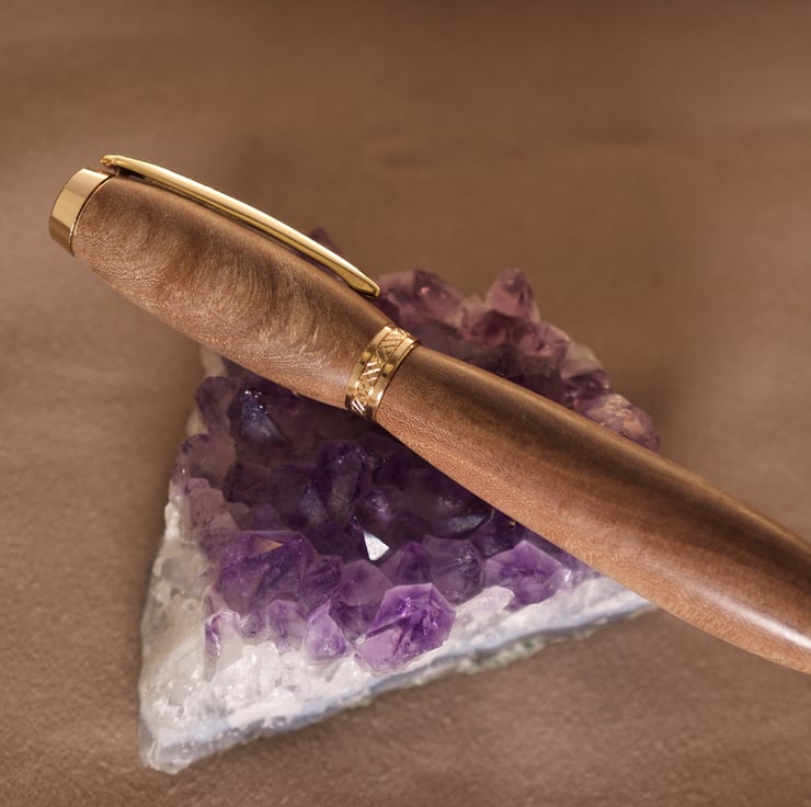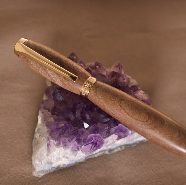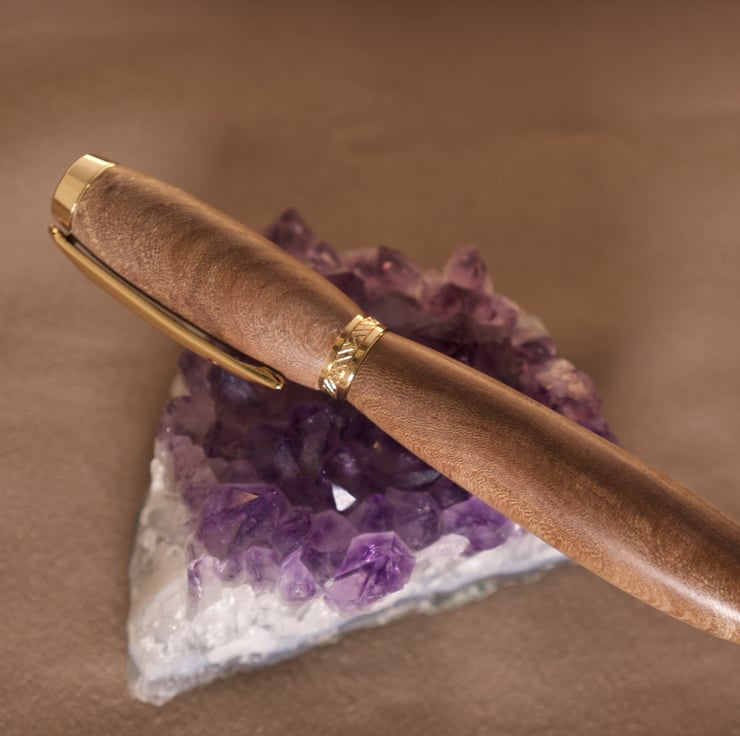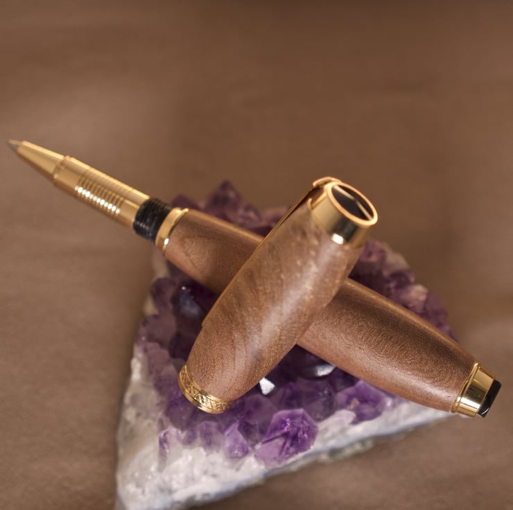 Crafted in my workshop overlooking the sea on the island of Sanday, the pen uses a Schmidt 888 refill (widely available) which has very quick drying black ink, making the pen ideal for left-handed writers. Both finials, pocket clip and centre band are gold plated, and the finials also feature black accents. The cap has a triple-lead thread, which makes removing and replacing very quick, and the gold plated tip section unscrews to change the refill - take care to not loose the small spring inside the body of the pen.