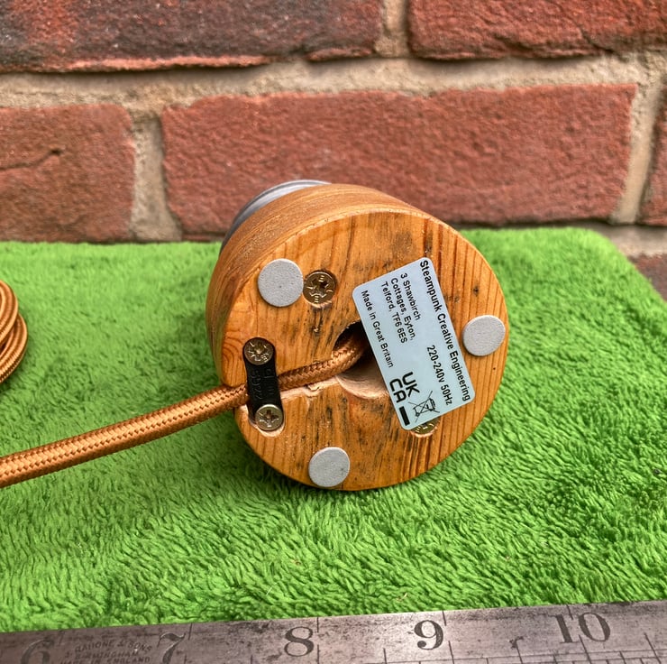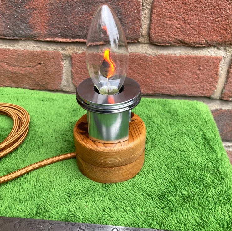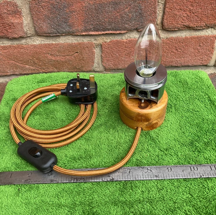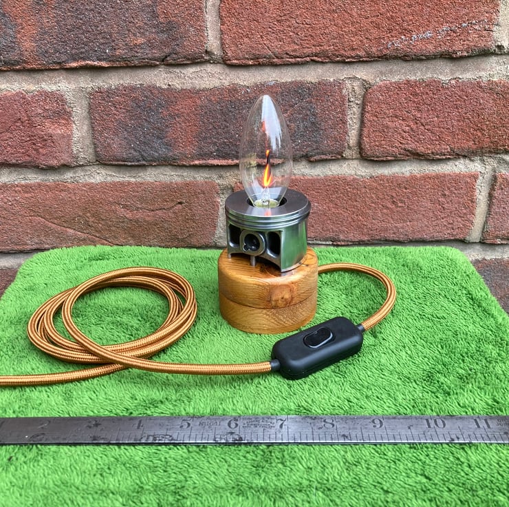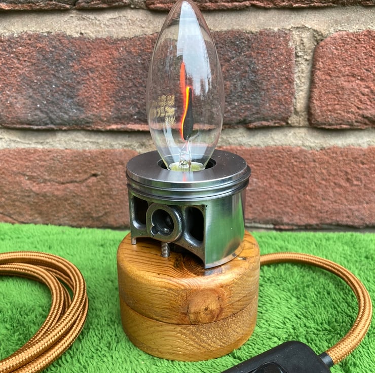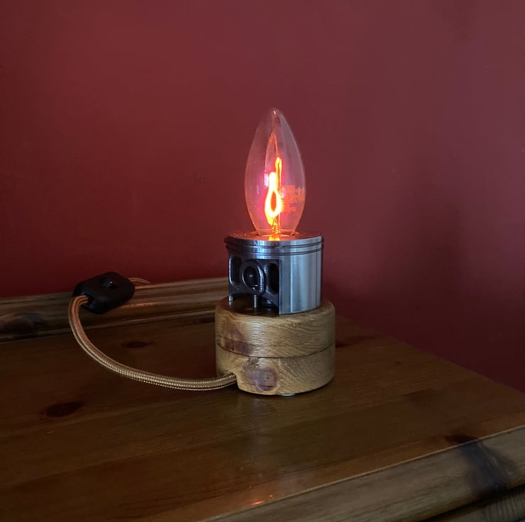 Something compact and subtle to set the mood in your home, a table lamp based on a piston taken from a chainsaw engine fitted with a flickering flame effect LED bulb. The piston, an aftermarket replacement for a 92cc, 660 model, heavy duty chainsaw made by a well-known and respected German manufacturer, has been bored out on my lathe to accommodate an insulated SES lampholder inside with just the glass of the flame effect bulb showing. I then polished it up to a nice shine before mounting the assembly on a round wooden base made from salvaged floorboard which has been sanded, stained and treated with French polish to give it a lovely finish. Power is supplied through 2 metres of antique gold fabric braided flex fitted with a black inline switch and black 3-amp fused UK plug. As always from Steampunk Creative Engineering, all electrical components are brand new and the unit is safety tested and certified UKCA compliant.