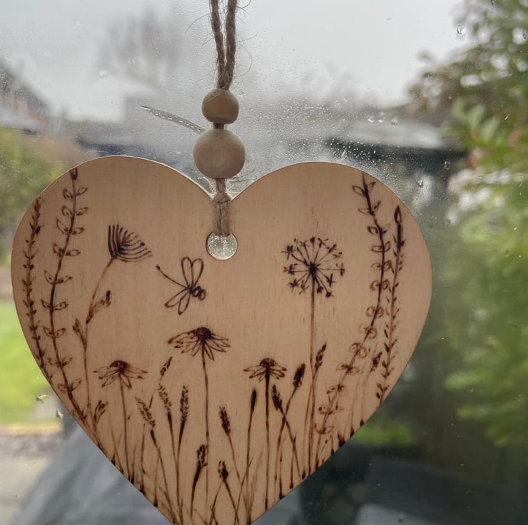 Flowers and a dragon fl, hung on jute string with added wooden bead decoration.