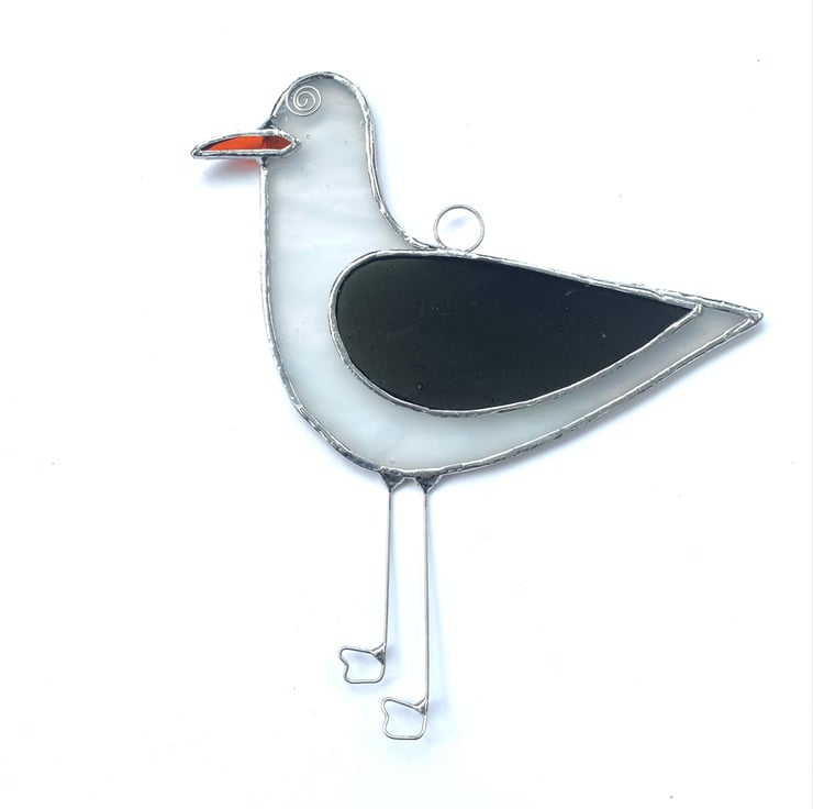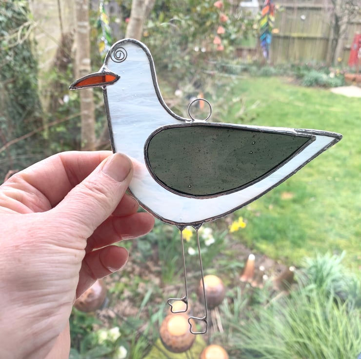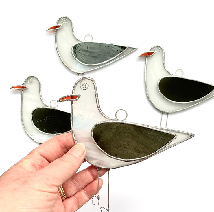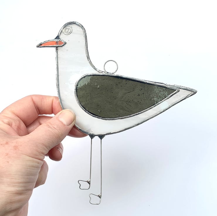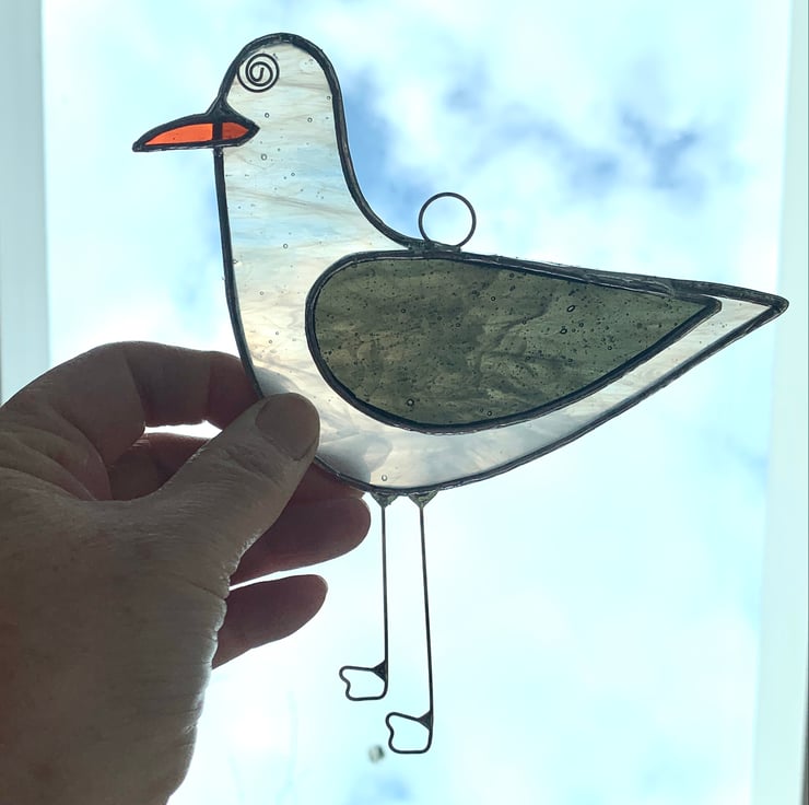 These seagull suncatchers have been made from white streaky sea glass, grey sea glass and orange rough textured glass for the beak. Each piece of glass has been hand cut, ground, copper foiled, soldered, washed and finally polished. The legs and eye have been made from tinned copper wire. A ring and length of fishing line has been added for hanging purposes.