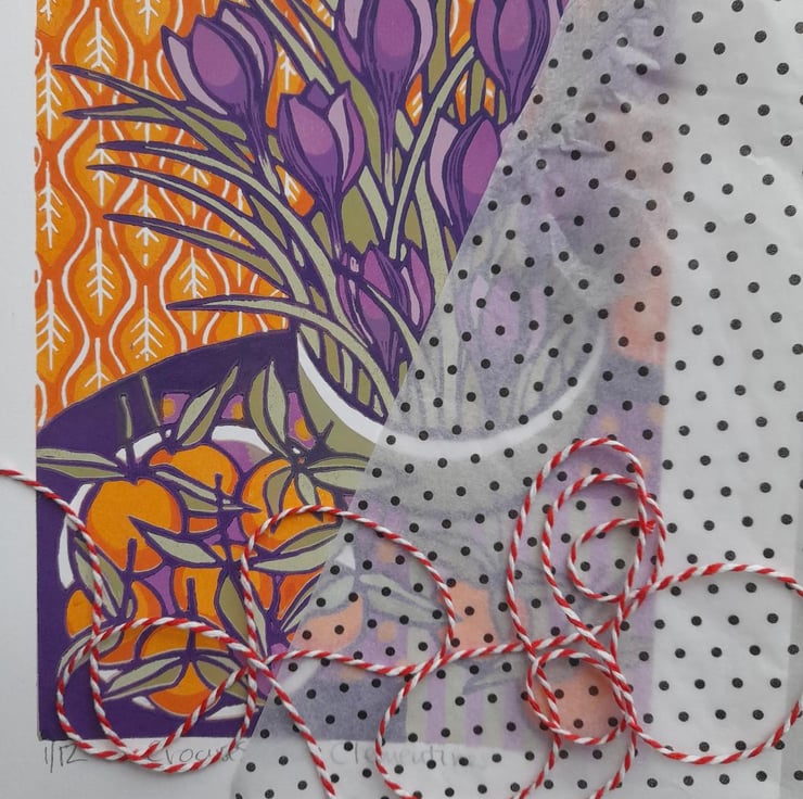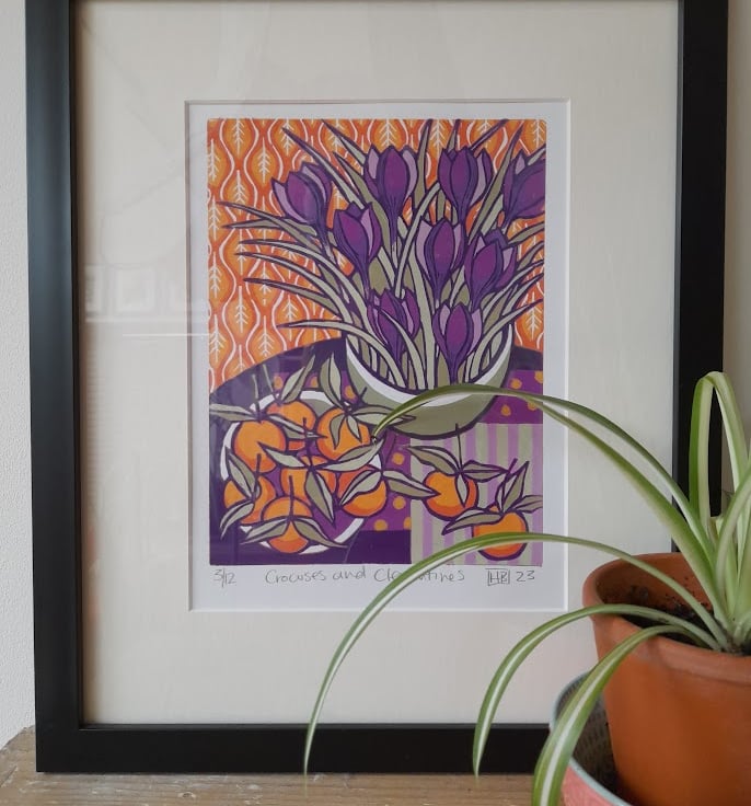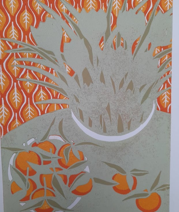 I use the reduction printmaking method in which the printable area of the lino is gradually cut away as each colour is printed and by the end there is no printable surface left. This is why the prints are limited editions as it is not possible to print any more. This is printed in 8 colours.