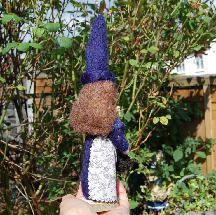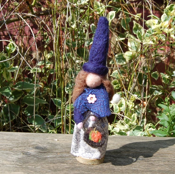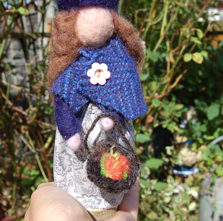 Corrine is wearing an Indigo witches hat and blue dress, covered with a warm blue woven wool shawl. A pretty cotton apron with floral print covers her blue dress. Wool basket filled with wool offcuts for herbs. Brown needlefelted hair.. She has been glued to a wood slice for stability.