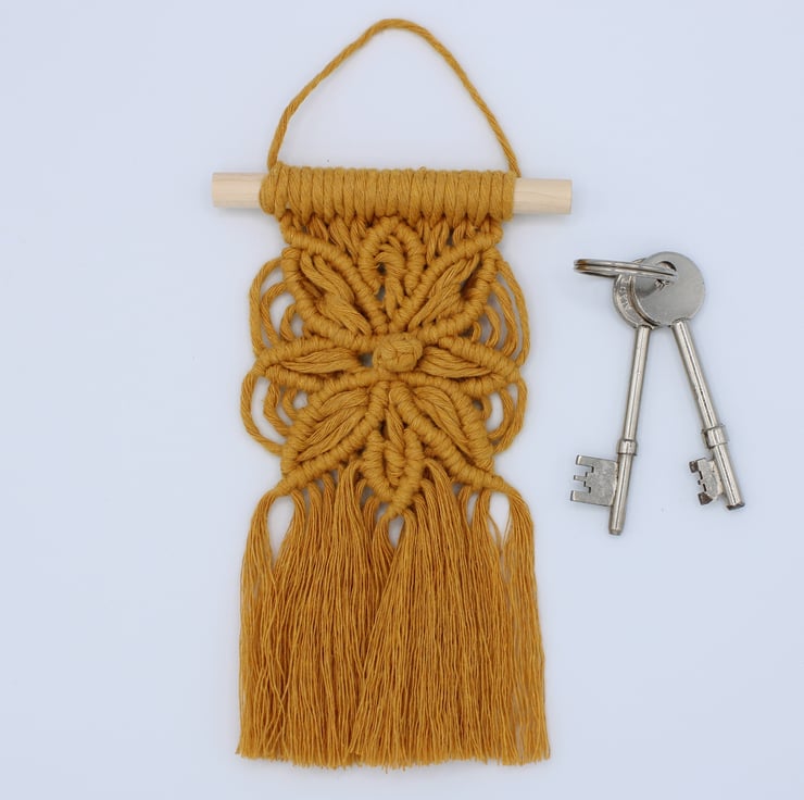A small macrame wall hanging with a flower design on it in a warm mustard colour, The wall hanging measures 16cm from the top of the 10cm wooden dowel it hangs on. It has been made using Bobbiny 100% recycled cotton.